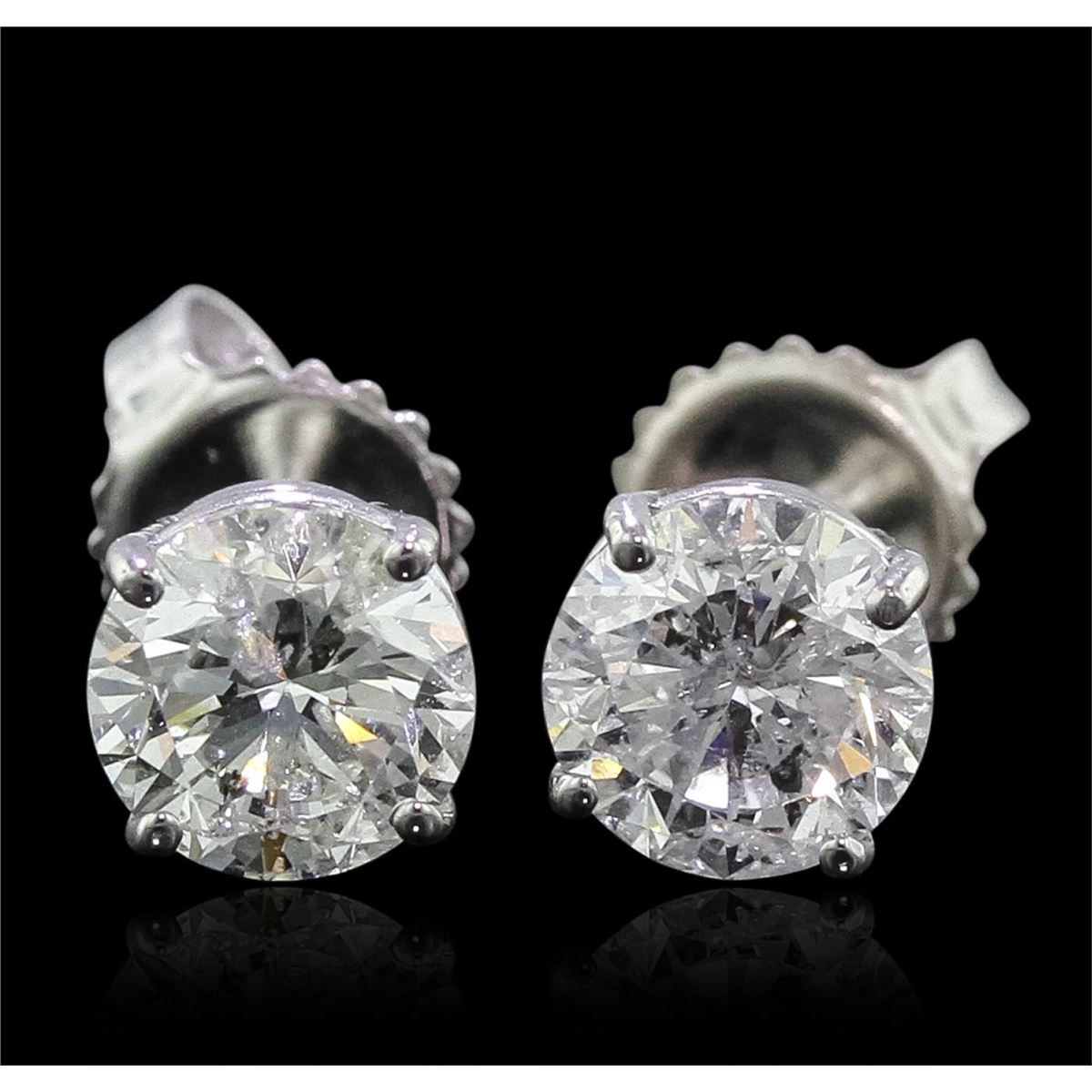One pair electronically tested 14KT white gold Ladies combination cast & assembled stud earrings with friction posts with a bright polish finish. Condition is new. Identified with markings of "14K". Containing: One prong set round brilliant cut diamond, measuring 6.38 - 6.30 x 4.27mm (depth est.) approximate weight of 1.05ct. Clarity: I-2. Color: G, Cut is Good. One prong set round brilliant cut diamond, measuring 6.30 - 6.30 x 4.24mm (depth est.) approximate weight of 1.03ct. Clarity: I-2. Color: J, Cut is Good. Diamonds graded in the mounting. Total Weight of Diamonds 2.07ct. Total Weight of Earrings 1.50 grams. GGL Appraised at $12,055.00.