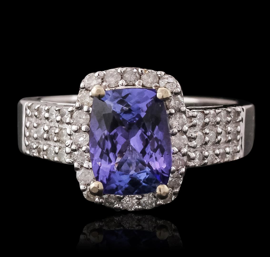One electronically tested 14KT white gold ladies combination cast & assembled tanzanite and diamond ring with a flat shank with a bright polish finish. Identified with markings of "14K". Condition is new. Containing: One prong set rectangular cushion modified brilliant cut natural tanzanite, measuring 9.00 x 6.85 x 4.28mm, approximate weight of 2.08ct., clarity is eye clean, type I, medium light, moderately strong, violet color, (GIA V 4/4), cut is good. Twenty-Three prong set round brilliant cut diamonds, measuring 1.50 - 1.50 x 0.90mm (depth est.) approximate total weight of 23 Stones = 0.28ct. Clarity: I-1 to I-3. Color: I - J, Cut is Good. Colored gemstones are presumed to have been subjected to commonly used enhancement processes. All diamonds and colored gemstones are graded in the mounting, unless otherwise stated. Total Weight of Colored Stones 2.08ct. Total Weight of Diamonds 0.28ct. Total Weight of Ring 5.20 grams. GGL Appraised at $5,400.00.