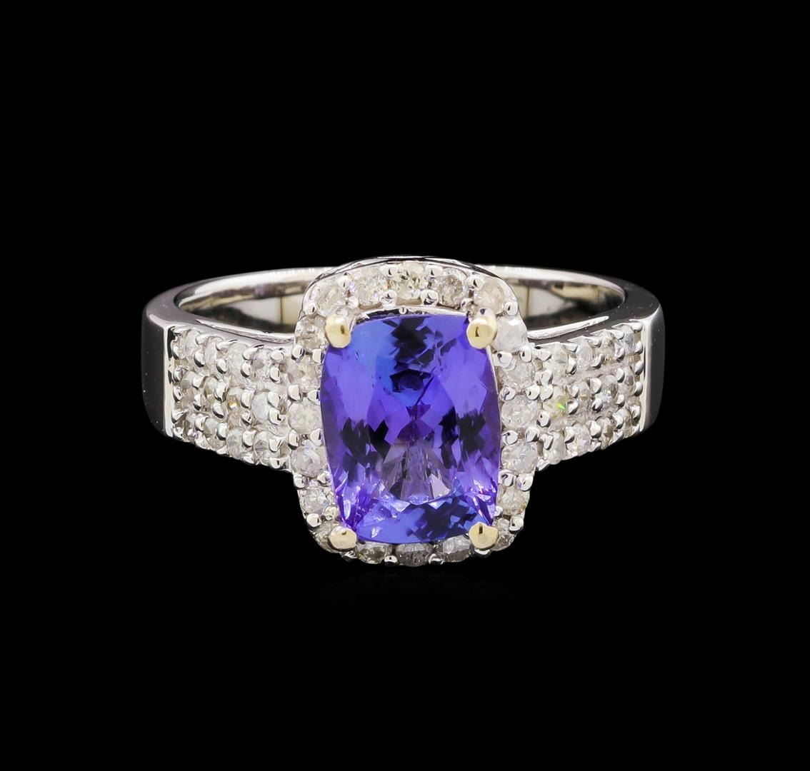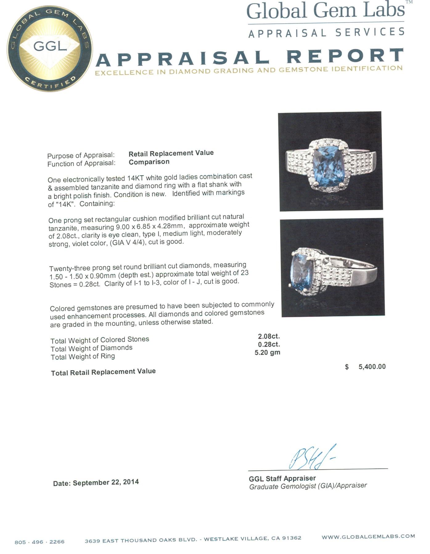 One electronically tested 14KT white gold ladies combination cast & assembled tanzanite and diamond ring with a flat shank with a bright polish finish. Identified with markings of "14K". Condition is new. Containing: One prong set rectangular cushion modified brilliant cut natural tanzanite, measuring 9.00 x 6.85 x 4.28mm, approximate weight of 2.08ct., clarity is eye clean, type I, medium light, moderately strong, violet color, (GIA V 4/4), cut is good. Twenty-Three prong set round brilliant cut diamonds, measuring 1.50 - 1.50 x 0.90mm (depth est.) approximate total weight of 23 Stones = 0.28ct. Clarity: I-1 to I-3. Color: I - J, Cut is Good. Colored gemstones are presumed to have been subjected to commonly used enhancement processes. All diamonds and colored gemstones are graded in the mounting, unless otherwise stated. Total Weight of Colored Stones 2.08ct. Total Weight of Diamonds 0.28ct. Total Weight of Ring 5.20 grams. GGL Appraised.