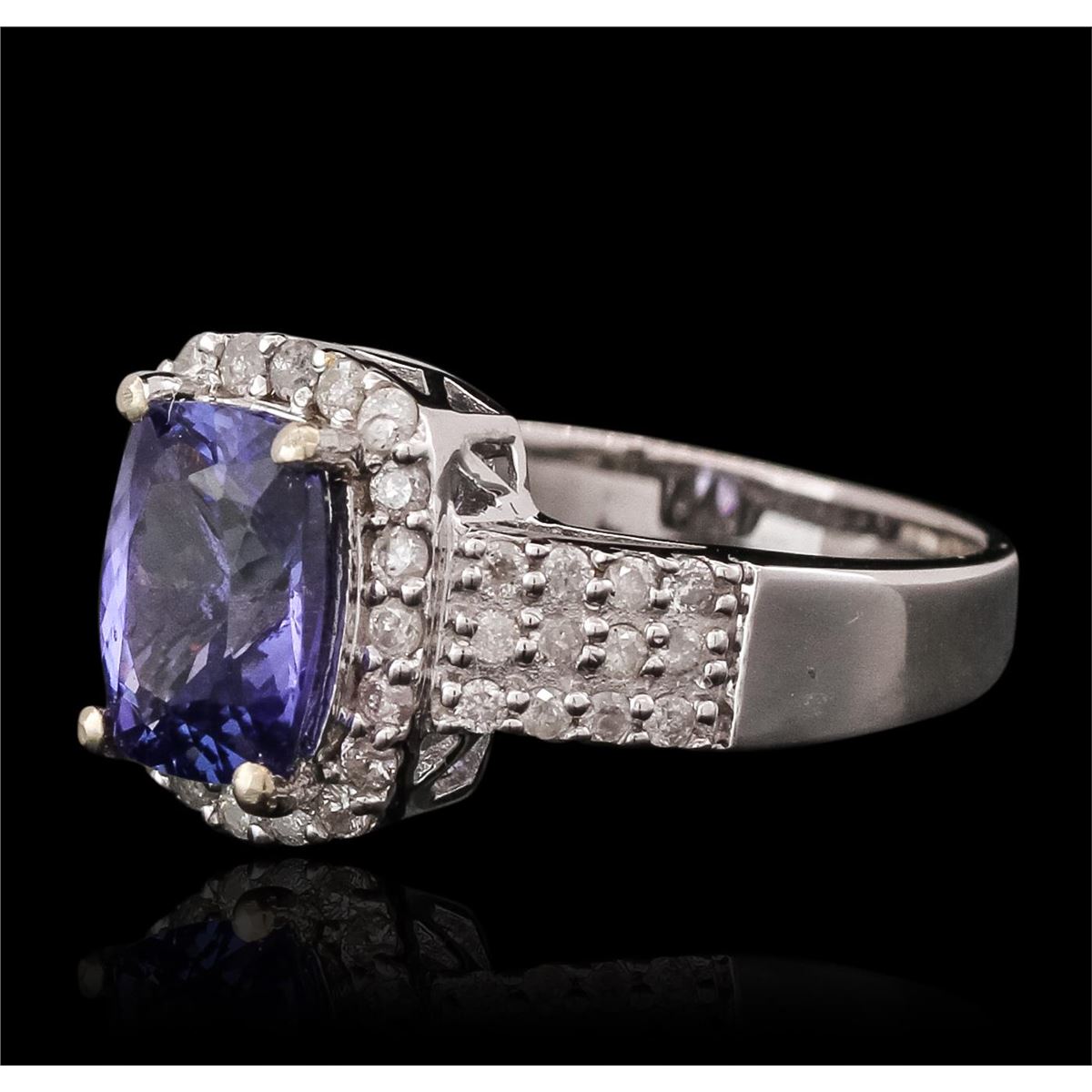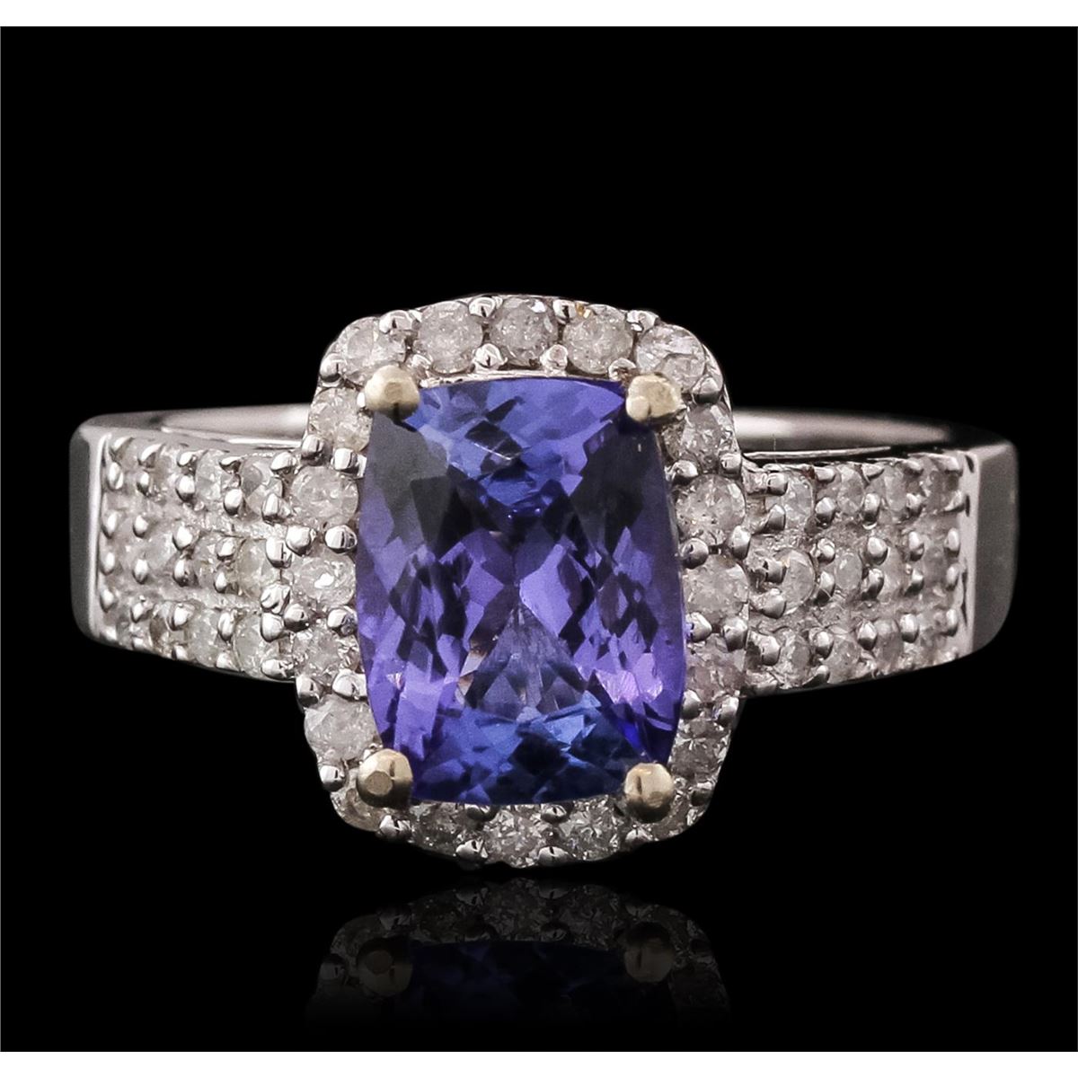 One electronically tested 14KT white gold ladies combination cast & assembled tanzanite and diamond ring with a flat shank with a bright polish finish. Identified with markings of "14K". Condition is new. Containing: One prong set rectangular cushion modified brilliant cut natural tanzanite, measuring 9.00 x 6.85 x 4.28mm, approximate weight of 2.08ct., clarity is eye clean, type I, medium light, moderately strong, violet color, (GIA V 4/4), cut is good. Twenty-Three prong set round brilliant cut diamonds, measuring 1.50 - 1.50 x 0.90mm (depth est.) approximate total weight of 23 Stones = 0.28ct. Clarity: I-1 to I-3. Color: I - J, Cut is Good. Colored gemstones are presumed to have been subjected to commonly used enhancement processes. All diamonds and colored gemstones are graded in the mounting, unless otherwise stated. Total Weight of Colored Stones 2.08ct. Total Weight of Diamonds 0.28ct. Total Weight of Ring 5.20 grams. GGL Appraised at $5,400.00.