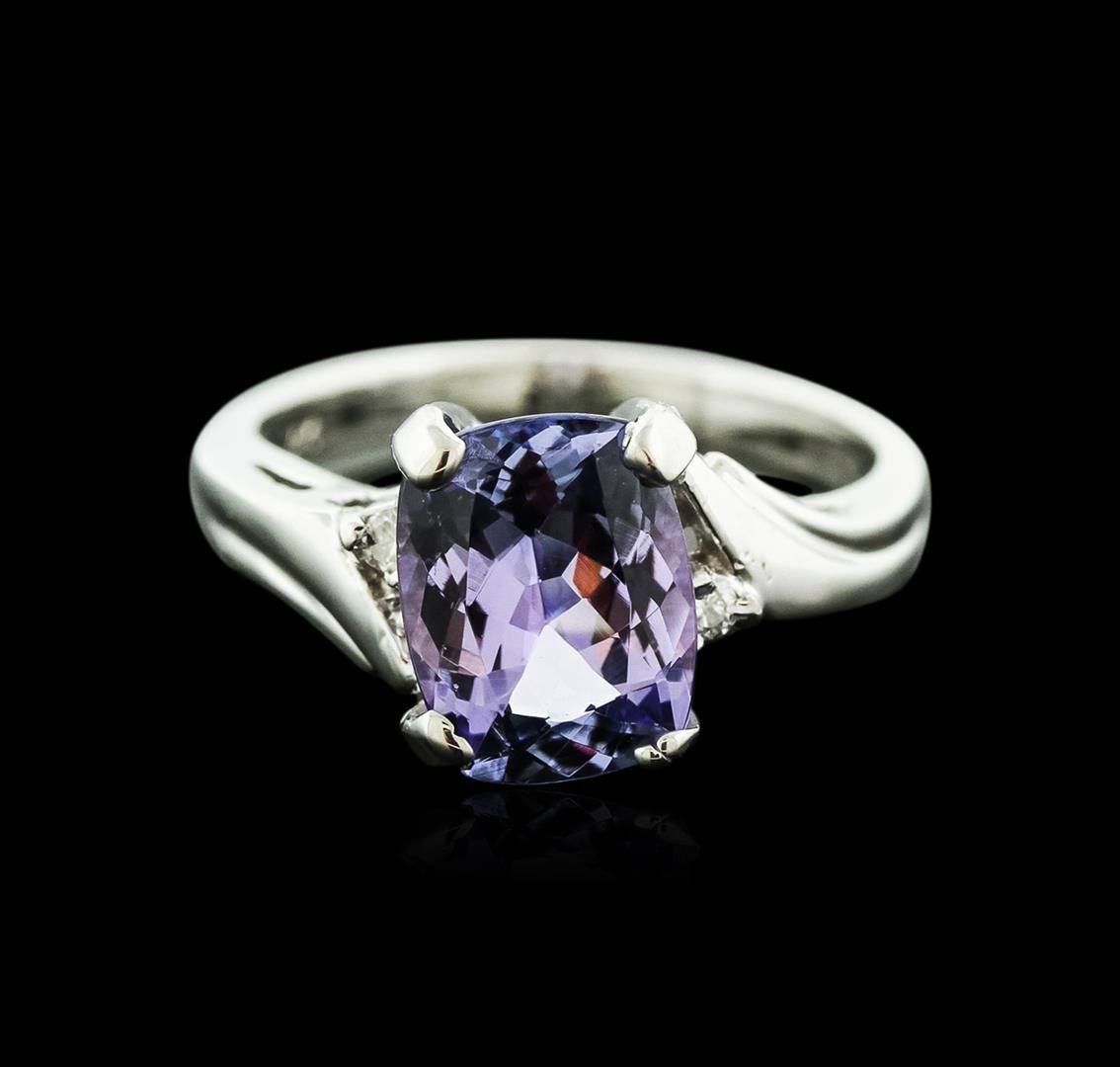 One electronically tested 14KT white gold ladies cast tanzanite and diamond ring with a bright polish finish. Identified with markings of "14K". Condition is new. Containing: One prong set rectangular cushion modified brilliant cut natural tanzanite, measuring 9.00 x 7.00 x 4.20mm, approximate weight of 2.08ct., clarity is eye clean, type I, medium, very slightly grayish, violet color, (GIA V 5/3), cut is good. Two prong set round brilliant cut diamonds, measuring 1.30 - 1.30 x 0.78mm (depth est.) approximate total weight of 2 Stones = 0.02ct. Clarity: SI-1 to SI-2. Color: H - I, Cut is Good. Colored gemstones are presumed to have been subjected to commonly used enhancement processes. All diamonds and colored gemstones are graded in the mounting, unless otherwise stated. Total Weight of Colored Stones 2.08ct. Total Weight of Diamonds 0.02ct. Total Weight of Ring 3.80 grams. GGL Appraised at $2,210.00.