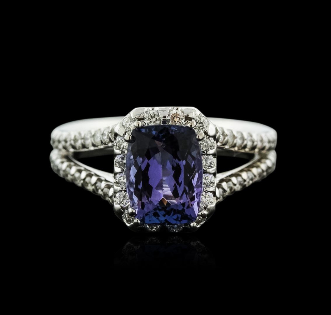 One electronically tested 14KT white gold ladies cast tanzanite and diamond ring with a bright polish finish. Identified with markings of "14K". Condition is new. Containing: One prong set rectangular cushion modified brilliant cut natural tanzanite, measuring 8.80 x 6.80 x 4.42mm, approximate weight of 2.08ct., clarity is eye clean, type I, medium light, very slightly grayish, violet color, (GIA V 4/3), cut is good. Fifty-Six prong set round brilliant cut diamonds, measuring 1.50 - 1.50 x 0.90mm (depth est.) approximate total weight of 56 Stones = 0.69ct. Clarity: SI-1 to I-1. Color: I - J, Cut is Good. Colored gemstones are presumed to have been subjected to commonly used enhancement processes. All diamonds and colored gemstones are graded in the mounting, unless otherwise stated. Total Weight of Colored Stones 2.08ct. Total Weight of Diamonds 0.69ct. Total Weight of Ring 5.90 grams. GGL Appraised at $3,380.00.