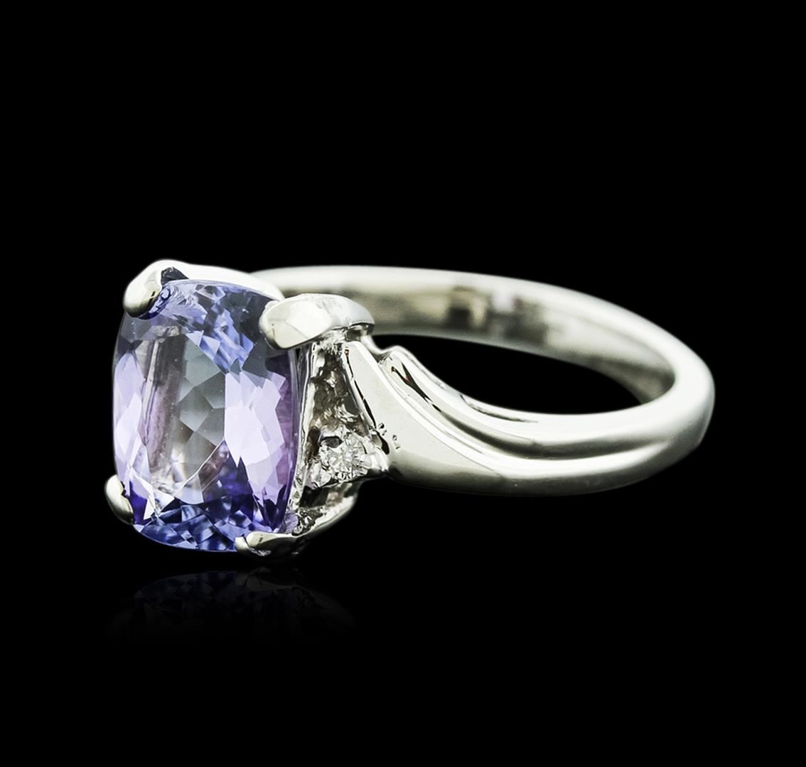 One electronically tested 14KT white gold ladies cast tanzanite and diamond ring with a bright polish finish. Identified with markings of "14K". Condition is new. Containing: One prong set rectangular cushion modified brilliant cut natural tanzanite, measuring 9.00 x 7.00 x 4.20mm, approximate weight of 2.08ct., clarity is eye clean, type I, medium, very slightly grayish, violet color, (GIA V 5/3), cut is good. Two prong set round brilliant cut diamonds, measuring 1.30 - 1.30 x 0.78mm (depth est.) approximate total weight of 2 Stones = 0.02ct. Clarity: SI-1 to SI-2. Color: H - I, Cut is Good. Colored gemstones are presumed to have been subjected to commonly used enhancement processes. All diamonds and colored gemstones are graded in the mounting, unless otherwise stated. Total Weight of Colored Stones 2.08ct. Total Weight of Diamonds 0.02ct. Total Weight of Ring 3.80 grams. GGL Appraised at $2,210.00.