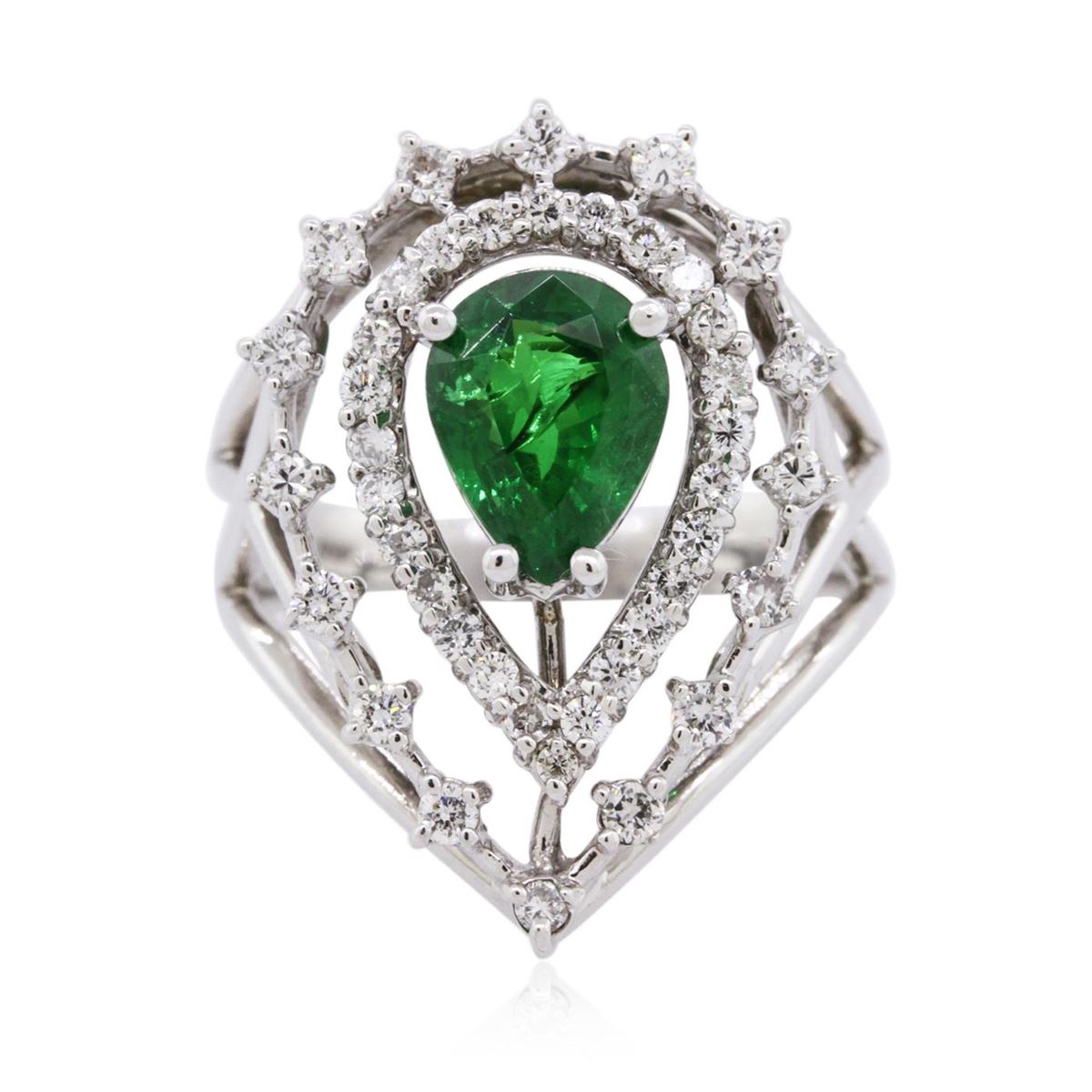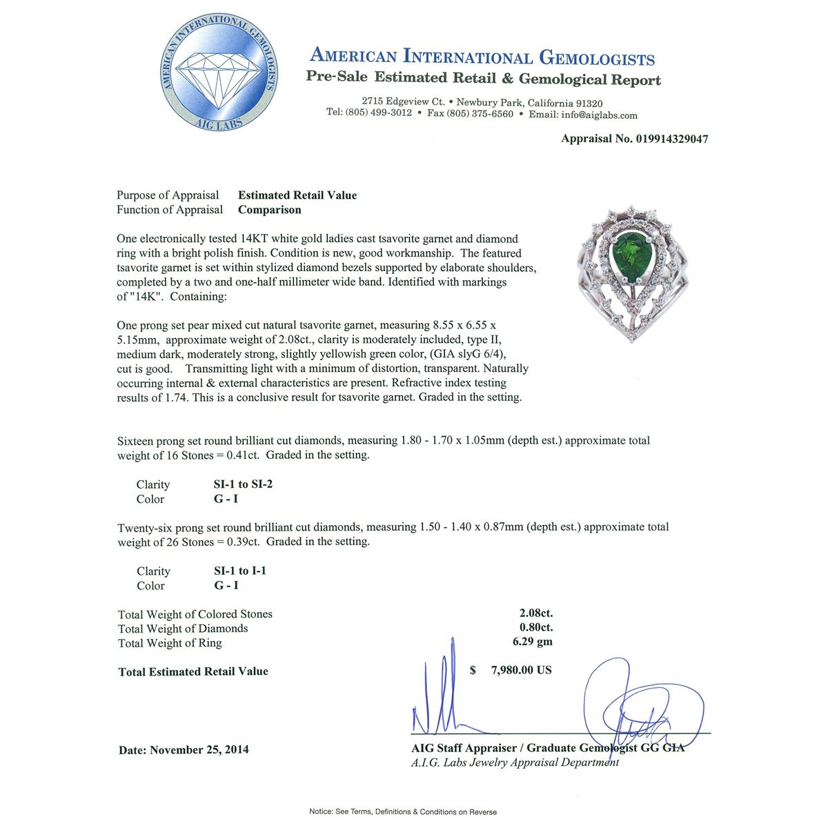 One electronically tested 14KT white gold ladies cast tsavorite garnet and diamond ring with a bright polish finish. The featured tsavorite garnet is set within stylized diamond bezels supported by elaborate shoulders, completed by a two and one-half millimeter wide band. Identified with markings of "14K". Condition is new, good workmanship. Containing: One prong set pear mixed cut natural tsavorite garnet, measuring 8.55 x 6.55 x 5.15mm, approximate weight of 2.08ct., clarity is moderately included, type II, medium dark, moderately strong, slightly yellowish green color, (GIA slyG 6/4), cut is good. Transmitting light with a minimum of distortion, transparent. Naturally occurring internal & external characteristics are present. Refractive index testing results of 1.74. This is a conclusive result for tsavorite garnet. Graded in the setting. Sixteen prong set round brilliant cut diamonds, measuring 1.80 - 1.70 x 1.05mm (depth est.) approximate total weight of 16 Stones = 0.41ct. Graded in the setting. Clarity: SI-1 to SI-2. Color: G - I Twenty-Six prong set round brilliant cut diamonds, measuring 1.50 - 1.40 x 0.87mm (depth est.) approximate total weight of 26 Stones = 0.39ct. Graded in the setting. Clarity: SI-1 to I-1. Color: G - I. Total Weight of Colored Stones 2.08ct. Total Weight of Diamonds 0.80ct. Total Weight of Ring 6.29 grams. AIG Appraised at $7,980.00.