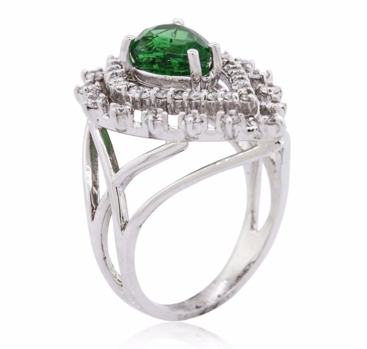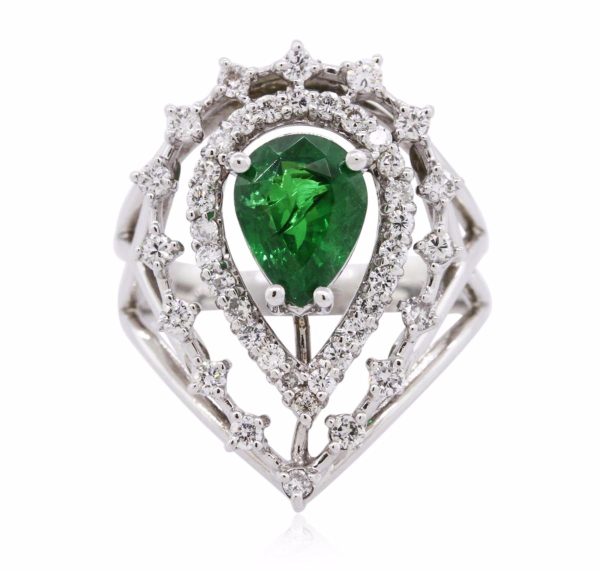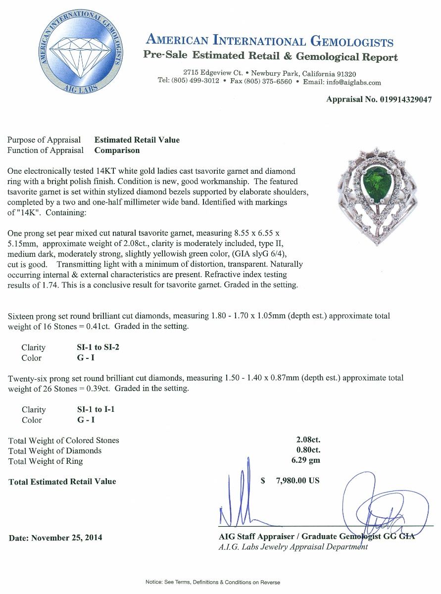 One electronically tested 14KT white gold ladies cast tsavorite garnet and diamond ring with a bright polish finish. The featured tsavorite garnet is set within stylized diamond bezels supported by elaborate shoulders, completed by a two and one-half millimeter wide band. Identified with markings of "14K". Condition is new, good workmanship. Containing: One prong set pear mixed cut natural tsavorite garnet, measuring 8.55 x 6.55 x 5.15mm, approximate weight of 2.08ct., clarity is moderately included, type II, medium dark, moderately strong, slightly yellowish green color, (GIA slyG 6/4), cut is good. Transmitting light with a minimum of distortion, transparent. Naturally occurring internal & external characteristics are present. Refractive index testing results of 1.74. This is a conclusive result for tsavorite garnet. Graded in the setting. Sixteen prong set round brilliant cut diamonds, measuring 1.80 - 1.70 x 1.05mm (depth est.) approximate total weight of 16 Stones = 0.41ct. Graded in the setting. Clarity: SI-1 to SI-2. Color: G - I Twenty-Six prong set round brilliant cut diamonds, measuring 1.50 - 1.40 x 0.87mm (depth est.) approximate total weight of 26 Stones = 0.39ct. Graded in the setting. Clarity: SI-1 to I-1. Color: G - I. Total Weight of Colored Stones 2.08ct. Total Weight of Diamonds 0.80ct. Total Weight of Ring 6.29 grams. AIG Appraised at $7,980.00.