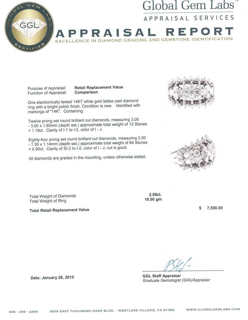 One electronically tested 14KT white gold ladies cast diamond ring with a bright polish finish. Identified with markings of "14K". Condition is new. Containing: Twelve prong set round brilliant cut diamonds, measuring 3.00 - 3.00 x 1.80mm (depth est.) approximate total weight of 12 Stones = 1.19ct. Clarity: I-1 to I-2. Color: I - J. Eighty-Four prong set round brilliant cut diamonds, measuring 2.50 - 1.30 x 1.14mm (depth est.) approximate total weight of 84 Stones = 0.90 ct. Clarity: SI-2 to I-2. Color: I - J, Cut is Good. All diamonds are graded in the mounting, unless otherwise stated. Total Weight of Diamonds 2.09ct. Total Weight of Ring 10.00 grams. GGL Appraised.