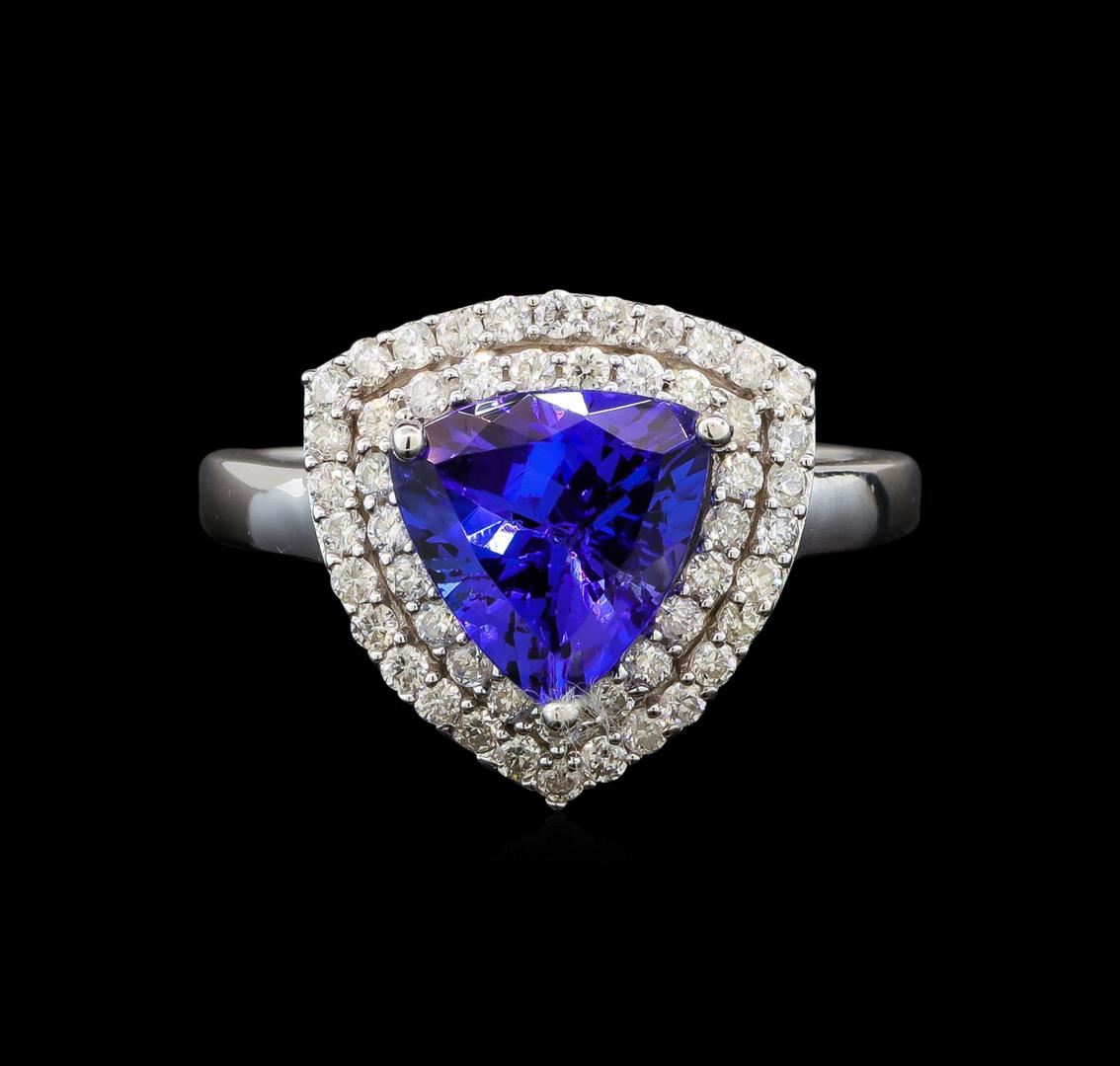 One electronically tested 14KT white gold ladies cast tanzanite and diamond ring with a flat shank with a bright polish finish. Trademark is Orianne. Identified with markings of "14K". Condition is new. Containing: One prong set triangle modified brilliant cut natural tanzanite, measuring 8.25 x 8.64 x 4.86mm, approximate weight of 2.09ct., clarity is eye clean, type I, medium light, very slightly grayish, bluish violet color, (GIA bV 4/3), cut is good. Fifty-One prong set round brilliant cut diamonds, measuring 1.20 - 1.20 x 0.72mm (depth est.) approximate total weight of 51 Stones = 0.32ct. Clarity: SI-2 to I-2. Color: I - J, Cut is Good. All diamonds and colored gemstones are graded in the mounting, unless otherwise stated. Colored gemstones are presumed to have been subjected to commonly used enhancement processes. Total Weight of Colored Stones 2.09ct. Total Weight of Diamonds 0.32ct. Total Weight of Ring 3.60 grams. GGL Appraised.