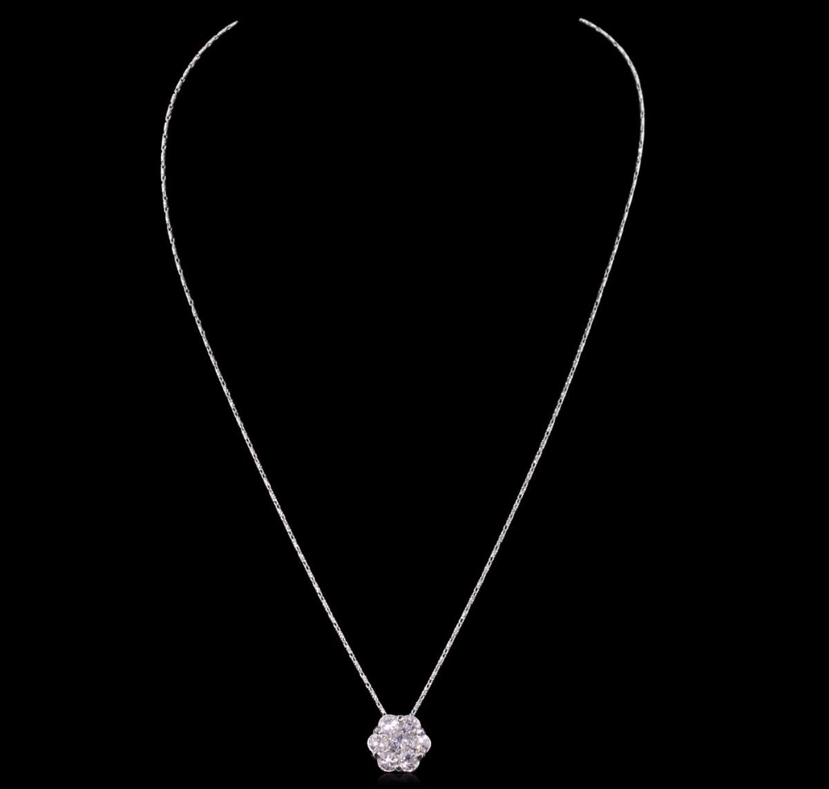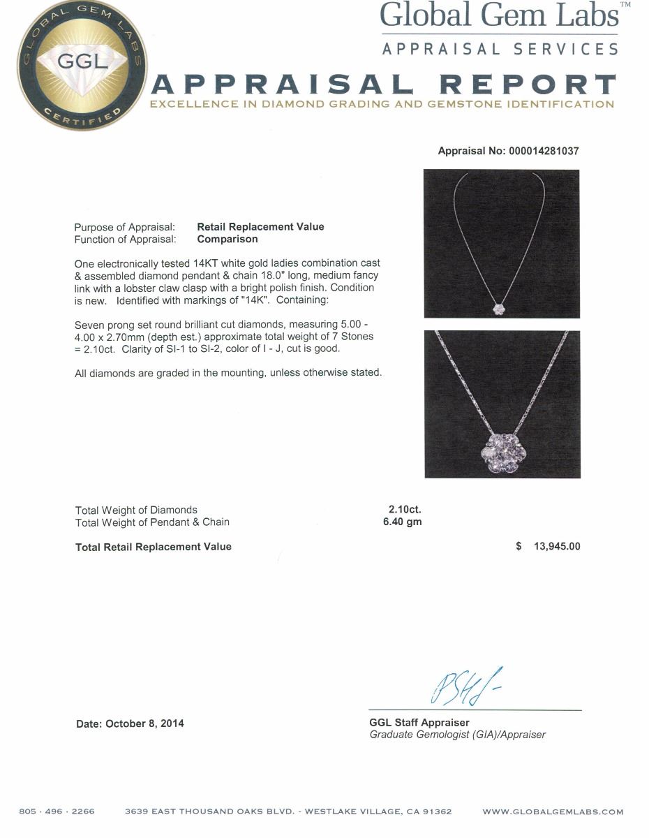 One electronically tested 14KT white gold ladies combination cast & assembled diamond pendant & chain 18.0" long, medium fancy link with a lobster claw clasp with a bright polish finish. Identified with markings of "14K". Condition is new. Containing: Seven prong set round brilliant cut diamonds, measuring 5.00 - 4.00 x 2.70mm (depth est.) approximate total weight of 7 Stones = 2.10ct. Clarity: SI-1 to SI-2. Color: I - J, Cut is Good. All diamonds are graded in the mounting, unless otherwise stated. Total Weight of Diamonds 2.10ct. Total Weight of Pendant & Chain 6.40 grams. GGL Appraised at $13,945.00.
