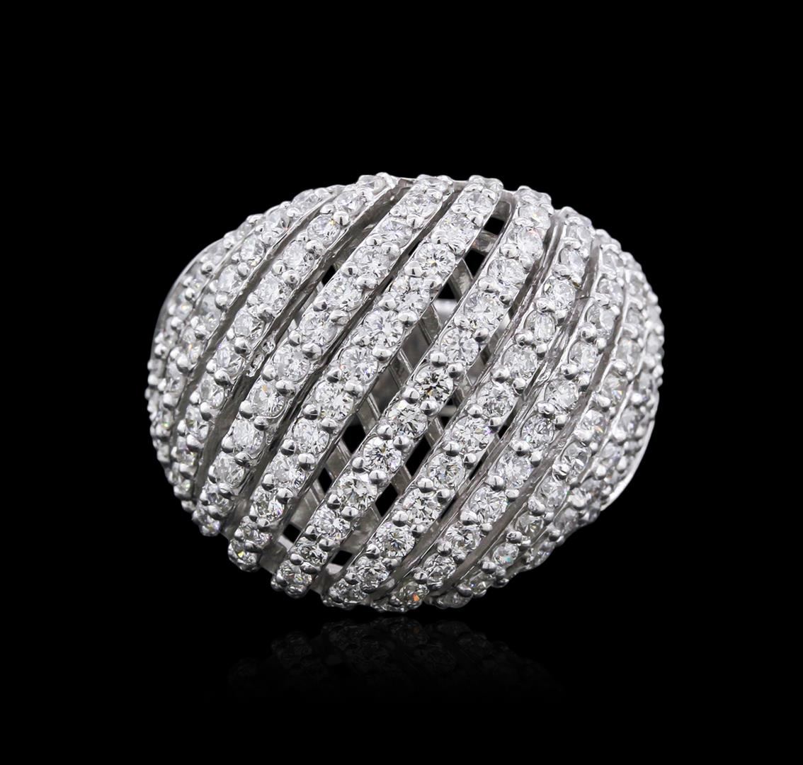One electronically tested 14KT white gold ladies cast diamond ring with a bright polish finish. Identified with markings of "14K". Condition is new. Containing: One Hundred Thirty-One prong set round brilliant cut diamonds, measuring 1.50 - 1.50 x 0.90mm (depth est.) approximate total weight of 131 Stones = 2.10ct. Clarity: SI-1 to I-1. Color: I - J, Cut is Very Good. All diamonds are graded in the mounting, unless otherwise stated. Total Weight of Diamonds 2.10ct. Total Weight of Ring 12.50 grams. GGL Appraised at $4,970.00.