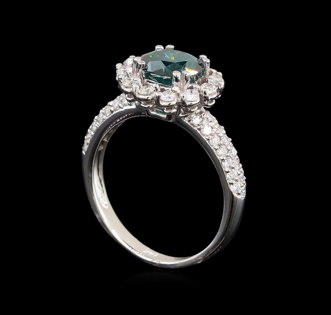 One electronically tested 14KT white gold ladies cast diamond engagement ring with a bright polish finish. Identified with markings of "K14". Condition is new. Containing: One prong set round brilliant cut diamond, measuring 7.50 - 7.50 x 4.50mm (depth est.) approximate weight of 1.54ct. Clarity: I-2, Cut is Good. Color of the stone has been treated. Twelve prong set round brilliant cut diamonds, measuring 1.90 - 1.90 x 1.14mm (depth est.) approximate total weight of 12 Stones = 0.30ct. Clarity: SI-1. Color: I - J, Cut is Good. Forty-Two prong set round brilliant cut diamonds, measuring 1.20 - 1.20 x 0.72mm (depth est.) approximate total weight of 42 Stones = 0.27ct. Clarity: I-1 to I-2. Color: I - J, Cut is Good. All diamonds are graded in the mounting, unless otherwise stated. Total Weight of Diamonds 2.11ct. Total Weight of Engagement Ring 4.60 grams. GGL Appraised at $6,345.00.