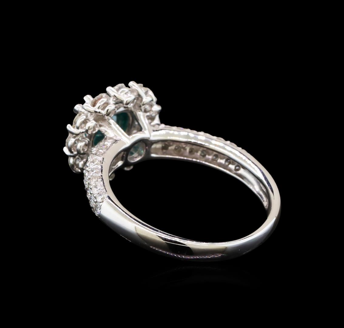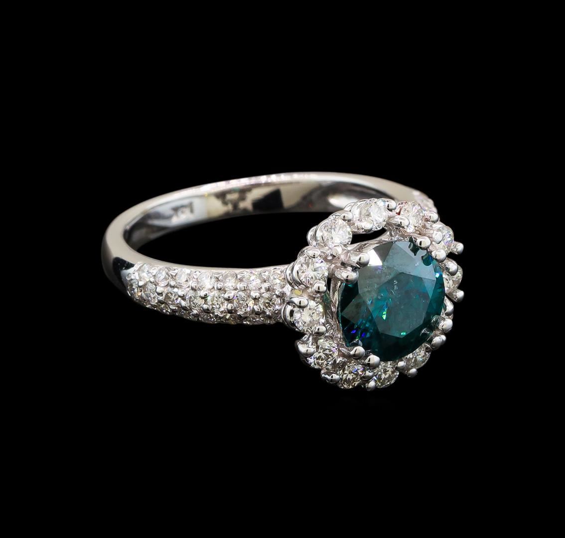 One electronically tested 14KT white gold ladies cast diamond engagement ring with a bright polish finish. Identified with markings of "K14". Condition is new. Containing: One prong set round brilliant cut diamond, measuring 7.50 - 7.50 x 4.50mm (depth est.) approximate weight of 1.54ct. Clarity: I-2, Cut is Good. Color of the stone has been treated. Twelve prong set round brilliant cut diamonds, measuring 1.90 - 1.90 x 1.14mm (depth est.) approximate total weight of 12 Stones = 0.30ct. Clarity: SI-1. Color: I - J, Cut is Good. Forty-Two prong set round brilliant cut diamonds, measuring 1.20 - 1.20 x 0.72mm (depth est.) approximate total weight of 42 Stones = 0.27ct. Clarity: I-1 to I-2. Color: I - J, Cut is Good. All diamonds are graded in the mounting, unless otherwise stated. Total Weight of Diamonds 2.11ct. Total Weight of Engagement Ring 4.60 grams. GGL Appraised at $6,345.00.