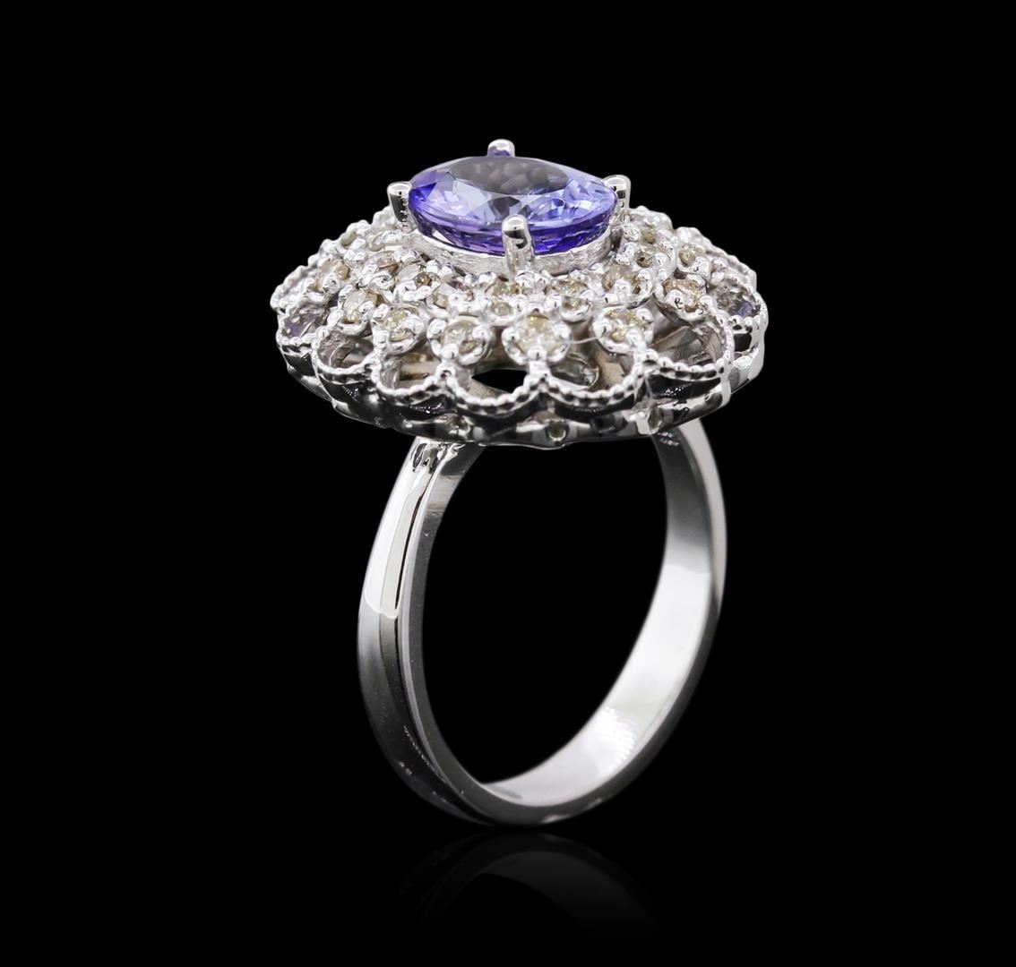 One electronically tested 14KT white gold ladies cast tanzanite and diamond ring with a tapered shank with a bright polish finish. Identified with markings of "14K". Condition is new. Containing: One prong set oval modified brilliant cut natural tanzanite, measuring 9.15 x 7.12 x 4.63mm, approximate weight of 2.12ct., clarity is eye clean, type I, medium light, very slightly grayish, violet color, (GIA V 4/3), cut is good. Twenty-Eight prong set round brilliant cut diamonds, measuring 1.40 - 1.40 x 0.84mm (depth est.) approximate total weight of 28 Stones = 0.28ct. Clarity: I-1 to I-2. Color: L - M, Cut is Good. Diamonds and colored gemstones are graded in the mounting, unless otherwise stated. Colored gemstones are presumed to have been subjected to commonly used enhancement processes. Total Weight of Colored Stones 2.12ct. Total Weight of Diamonds 0.28ct. Total Weight of Ring 8.30 grams. GGL Appraised.