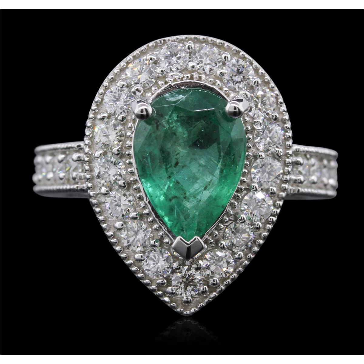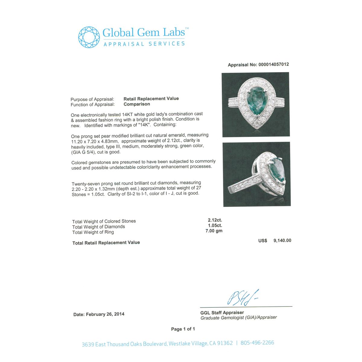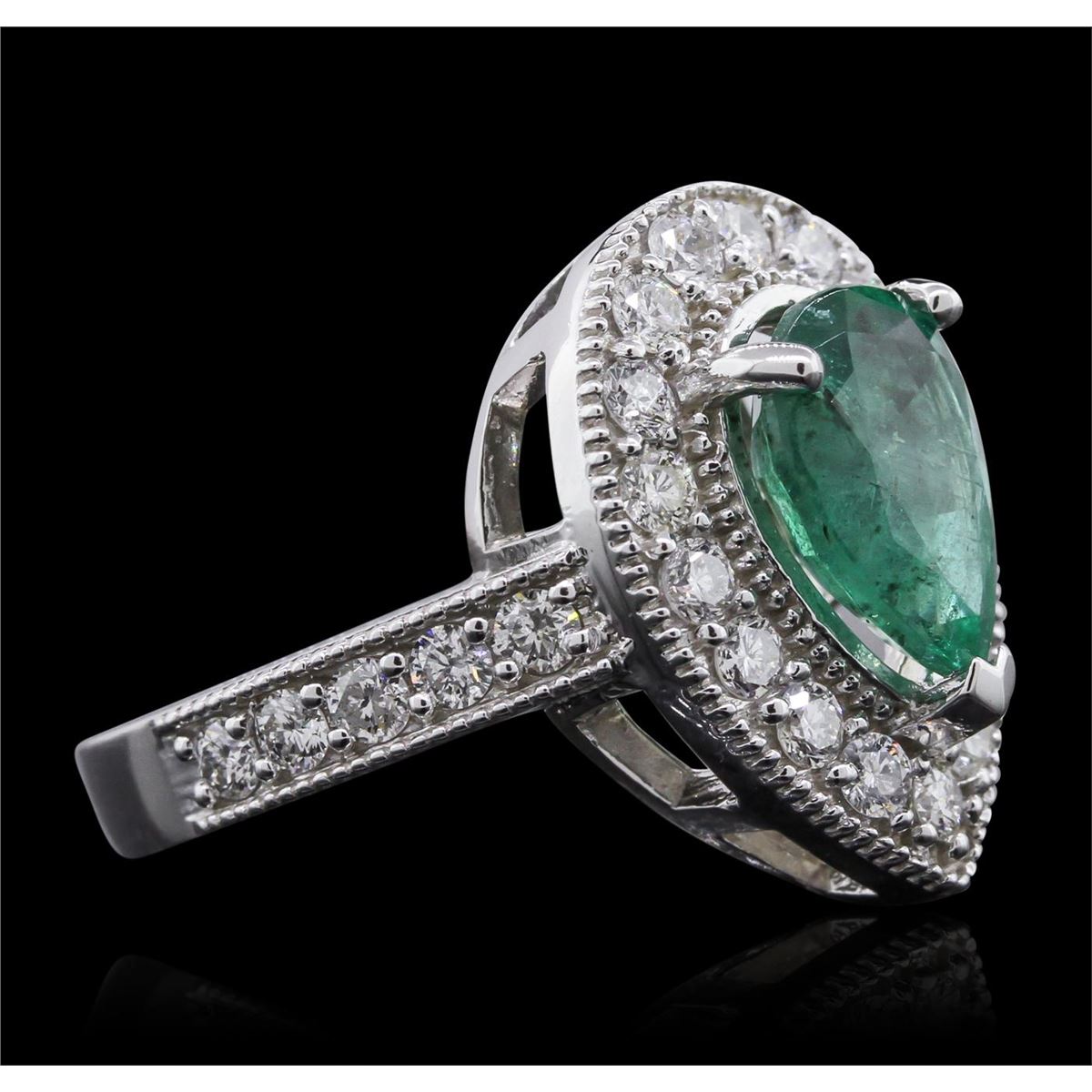 Great Condition! One electronically tested 14KT white gold Ladies combination cast & assembled fashion ring with a bright polish finish. Condition is new. Identified with markings of "14K". Containing: One prong set pear modified brilliant cut natural emerald, measuring 11.20 x 7.20 x 4.83mm, approximate weight of 2.12ct., clarity is heavily included, type III, medium, moderately strong, green color, (GIA G 5/4), cut is good. Colored gemstones are presumed to have been subjected to commonly used and possible undetectable color/clarity enhancement processes. Twenty-Seven prong set round brilliant cut diamonds, measuring 2.20 - 2.20 x 1.32mm (depth est.) approximate total weight of 27 Stones = 1.05ct. Clarity of SI-2 to I-1, Color of I - J, Cut is Good. Total Weight of Colored Stones 2.12ct. Total Weight of Diamonds 1.05ct. Total Weight of Ring 7.00 grams. GGL Appraised at $9,140.00.