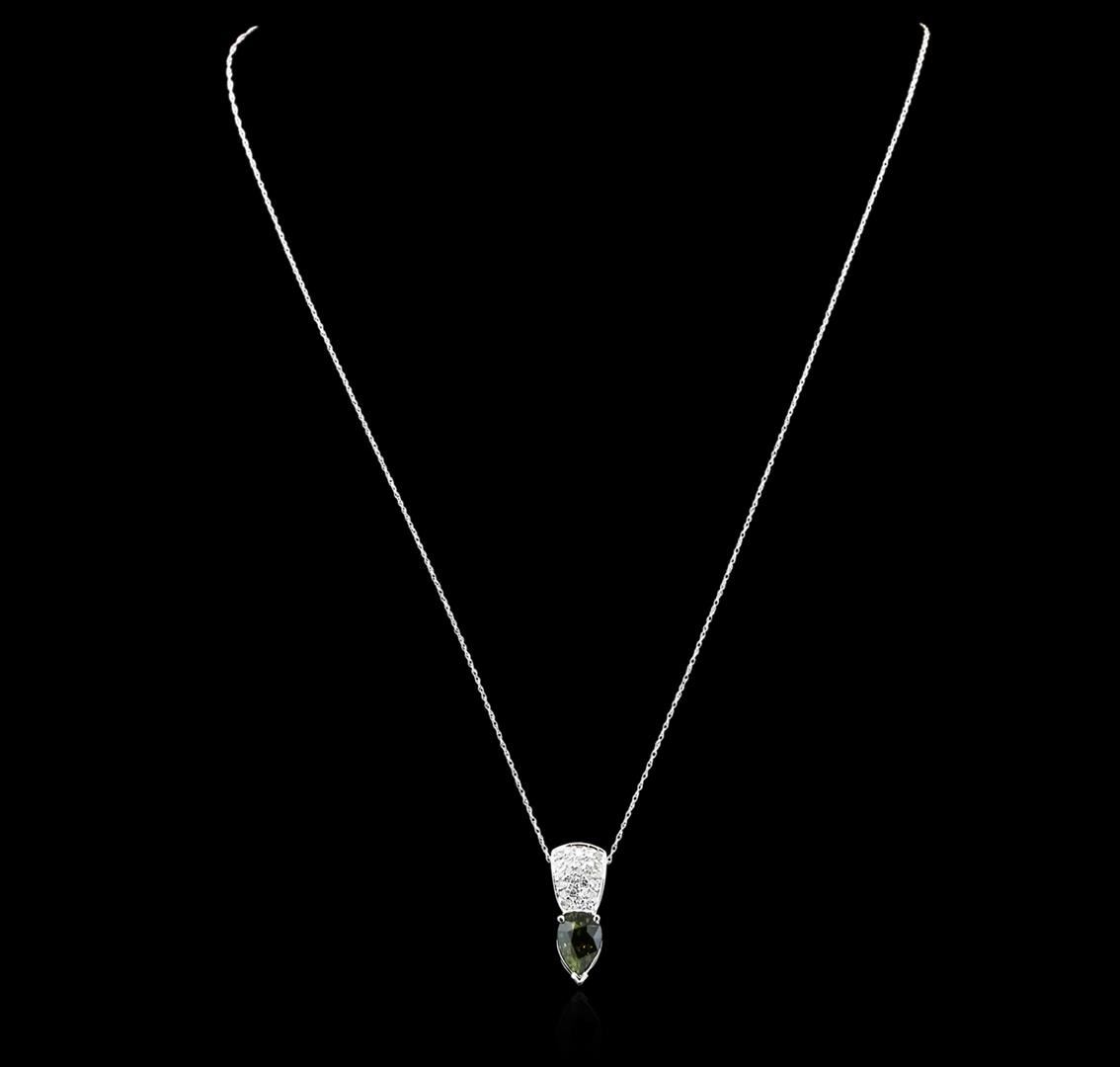 One pendant with chain featuring: 14KT white gold weighing 3.24 grams containing one green tourmaline with a total weight of 2.12ct and round diamonds with a total weight of 0.28cts.