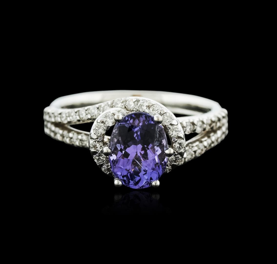 One electronically tested 14KT white gold ladies cast tanzanite and diamond ring with a bright polish finish. Identified with markings of "14K". Condition is new. Containing: One prong set oval modified brilliant cut natural tanzanite, measuring 8.50 x 7.40 x 4.81mm, approximate weight of 2.13ct., clarity is eye clean, type I, medium light, very slightly grayish, violet color, (GIA V 4/3), cut is good. Fifty prong set round brilliant cut diamonds, measuring 1.50 - 1.50 x 0.90mm (depth est.) approximate total weight of 50 Stones = 0.62ct. Clarity: SI-1 to SI-2. Color: I - J, Cut is Good. Colored gemstones are presumed to have been subjected to commonly used enhancement processes. All diamonds and colored gemstones are graded in the mounting, unless otherwise stated. Total Weight of Colored Stones 2.13ct. Total Weight of Diamonds 0.62ct. Total Weight of Ring 5.10 grams. GGL Appraised at $3,495.00.