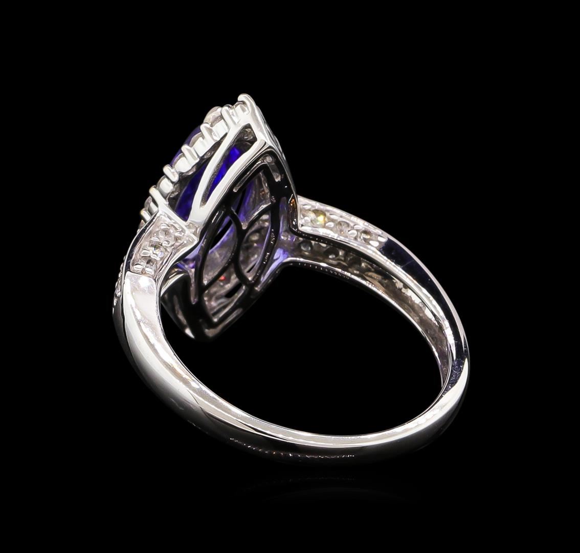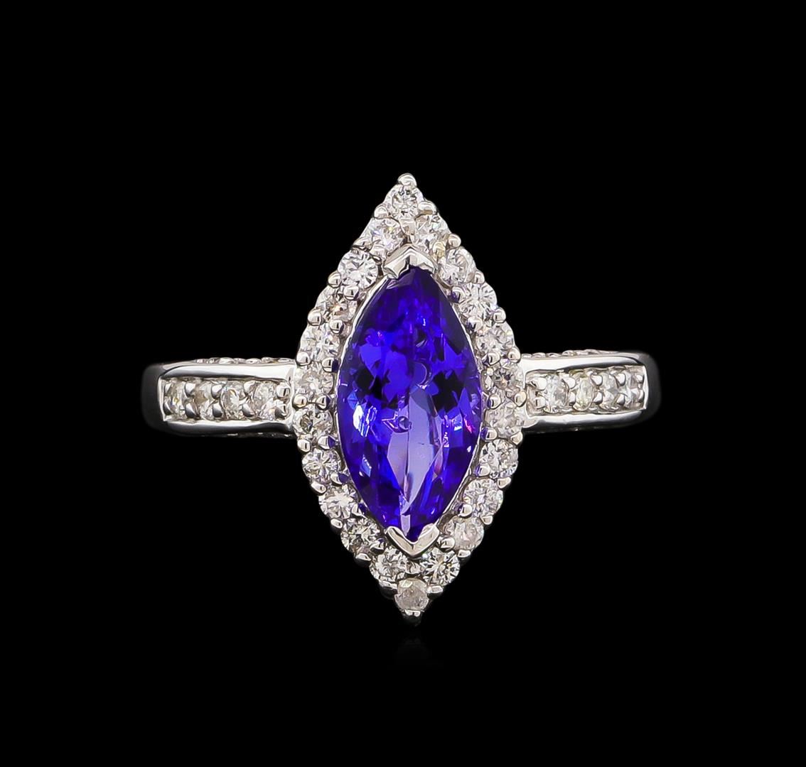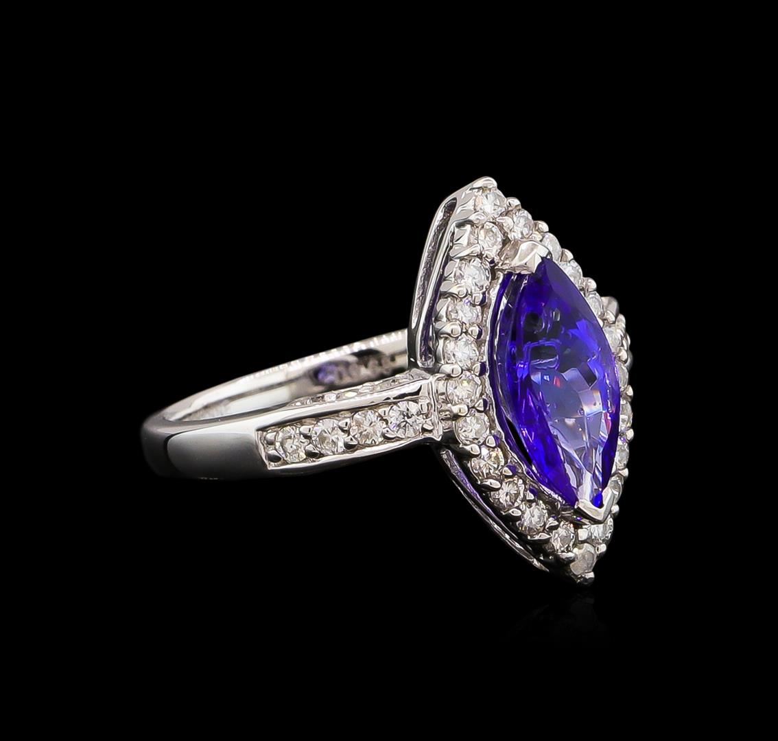 One electronically tested 14KT white gold Ladies combination cast & assembled ring with a bright polish finish. Condition is new. Identified with markings of "14K". Containing: One prong set marquise modified brilliant cut natural tanzanite, measuring 11.00 x 6.70 x 4.55mm, approximate weight of 2.13ct., clarity is eye clean, type I, medium, moderately strong, violet color, (GIA V 5/4), cut is good. Colored gemstones are presumed to have been subjected to commonly used color/clarity enhancement processes. Forty-Two prong set round brilliant cut diamonds, measuring 1.50 - 1.50 x 0.90mm (depth est.) approximate. Total Weight of 42 Stones = 0.63ct. Clarity: I-1 to I-2. Color: H - I, Cut is Good. Total Weight of Colored Stones 2.13ct. Total Weight of Diamonds 0.63ct. Total Weight of Ring 3.60 grams. GGL Appraised at $5,805.00.