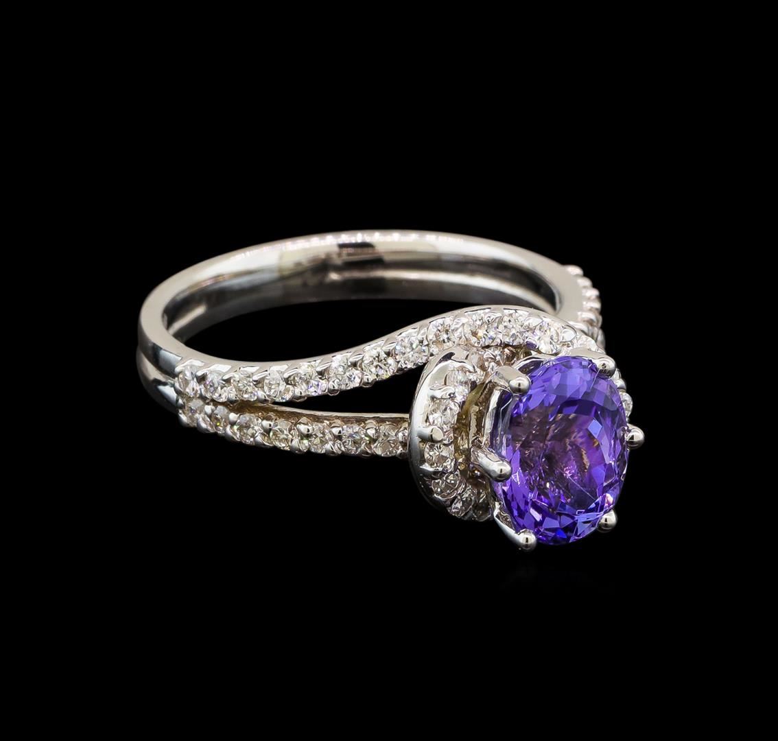 One electronically tested 14KT white gold ladies cast tanzanite and diamond ring with a bright polish finish. Identified with markings of "14K". Condition is new. Containing: One prong set oval modified brilliant cut natural tanzanite, measuring 8.50 x 7.40 x 4.81mm, approximate weight of 2.13ct., clarity is eye clean, type I, medium light, very slightly grayish, violet color, (GIA V 4/3), cut is good. Fifty prong set round brilliant cut diamonds, measuring 1.50 - 1.50 x 0.90mm (depth est.) approximate total weight of 50 Stones = 0.62ct. Clarity: SI-1 to SI-2. Color: I - J, Cut is Good. Colored gemstones are presumed to have been subjected to commonly used enhancement processes. All diamonds and colored gemstones are graded in the mounting, unless otherwise stated. Total Weight of Colored Stones 2.13ct. Total Weight of Diamonds 0.62ct. Total Weight of Ring 5.10 grams. GGL Appraised at $3,495.00.
