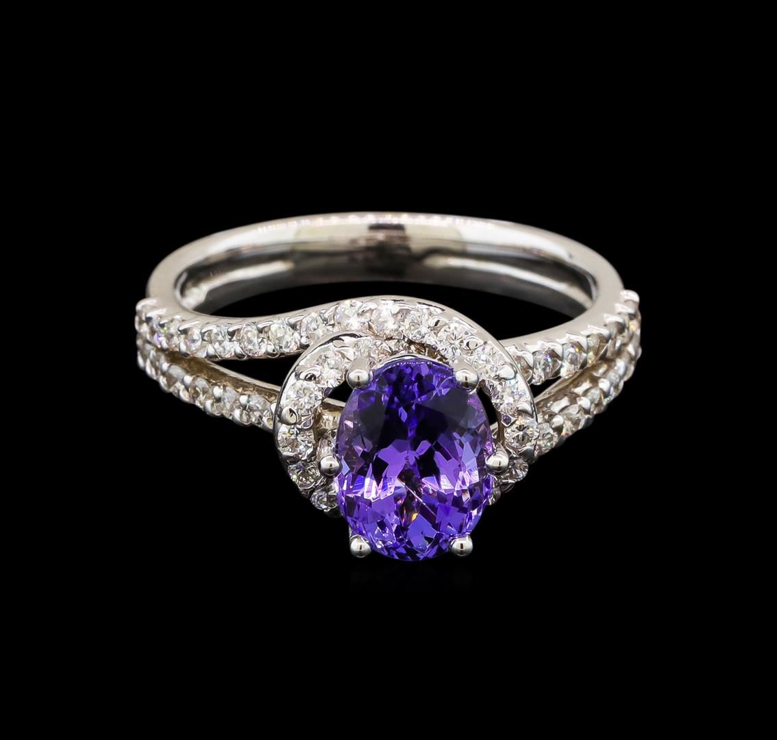 One electronically tested 14KT white gold ladies cast tanzanite and diamond ring with a bright polish finish. Identified with markings of "14K". Condition is new. Containing: One prong set oval modified brilliant cut natural tanzanite, measuring 8.50 x 7.40 x 4.81mm, approximate weight of 2.13ct., clarity is eye clean, type I, medium light, very slightly grayish, violet color, (GIA V 4/3), cut is good. Fifty prong set round brilliant cut diamonds, measuring 1.50 - 1.50 x 0.90mm (depth est.) approximate total weight of 50 Stones = 0.62ct. Clarity: SI-1 to SI-2. Color: I - J, Cut is Good. Colored gemstones are presumed to have been subjected to commonly used enhancement processes. All diamonds and colored gemstones are graded in the mounting, unless otherwise stated. Total Weight of Colored Stones 2.13ct. Total Weight of Diamonds 0.62ct. Total Weight of Ring 5.10 grams. GGL Appraised at $3,495.00.