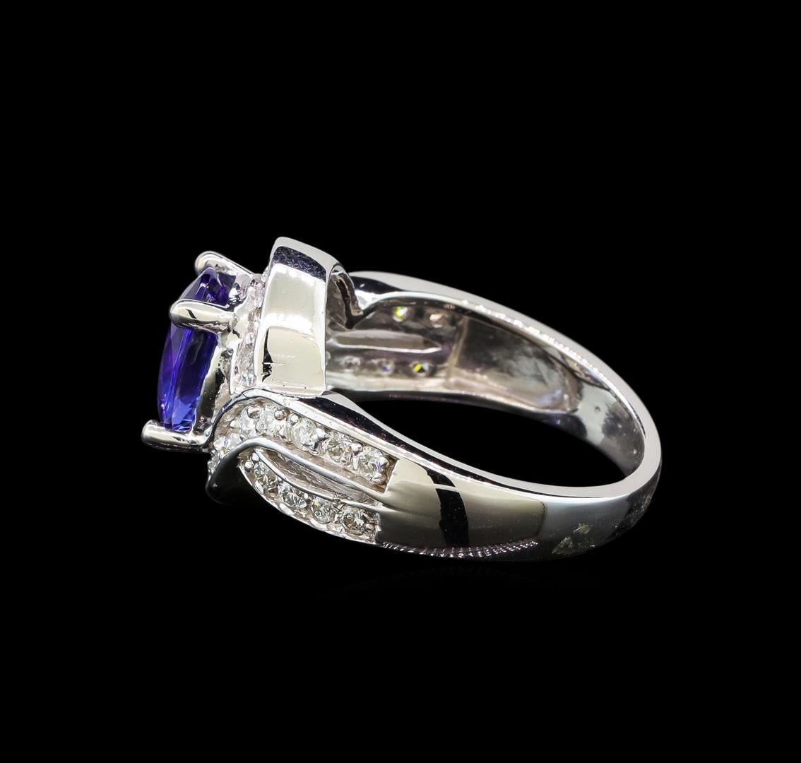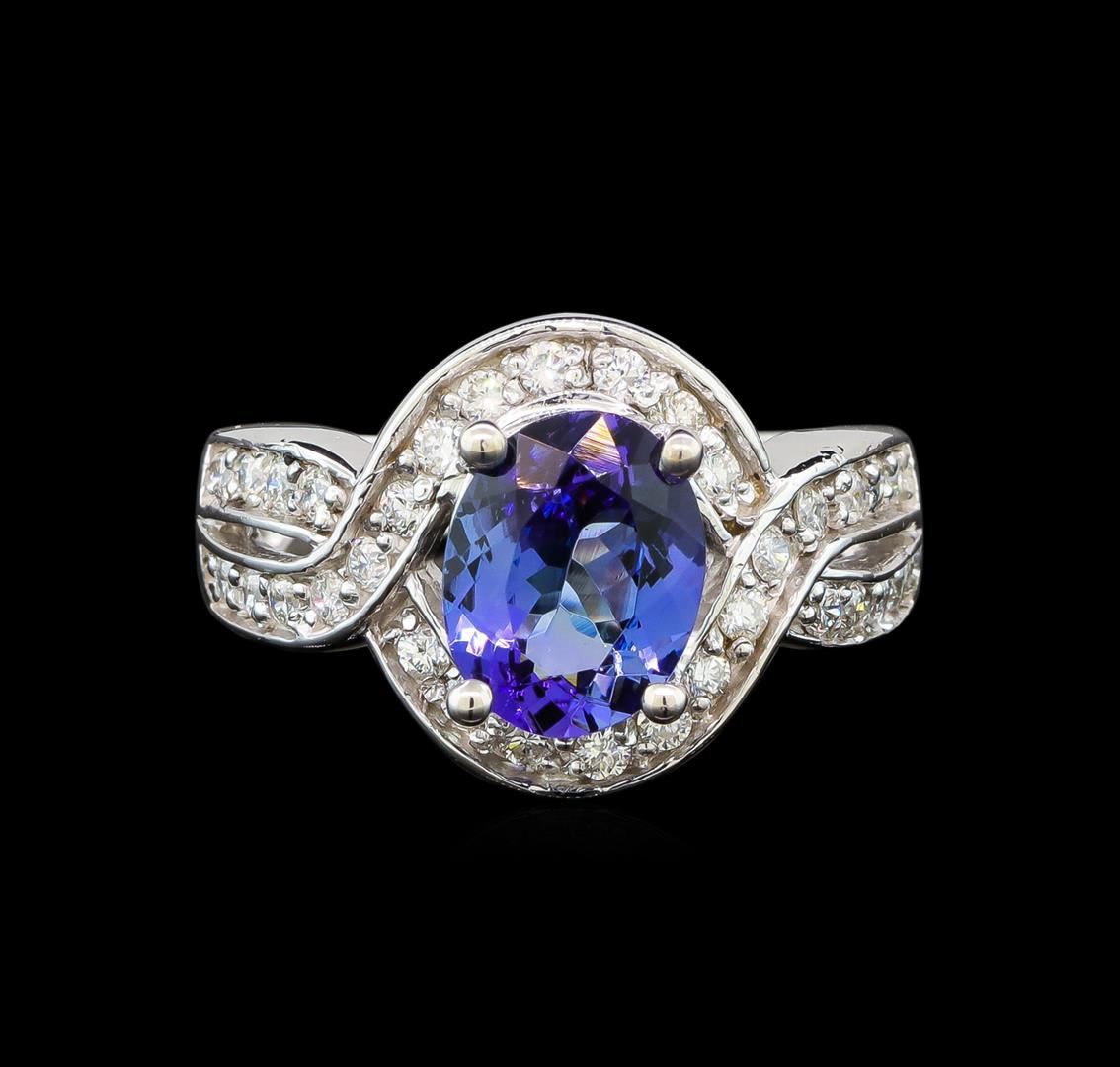 One electronically tested 14KT white gold ladies cast tanzanite and diamond ring with a bright polish finish. Condition is new. Containing: One prong set oval modified brilliant cut natural tanzanite, measuring 9.00 x 7.20 x 4.68mm, approximate weight of 2.13ct., clarity is eye clean, type I, medium light, very slightly grayish, violet color, (GIA V 4/3), cut is good. Thirty-Two prong set round brilliant cut diamonds, measuring 1.50 - 1.50 x 0.90mm (depth est.) approximate total weight of 32 Stones = 0.39ct. Clarity: SI-1 to SI-2. Color: I - J, Cut is Good. Colored gemstones are presumed to have been subjected to commonly used enhancement processes. All diamonds and colored gemstones are graded in the mounting, unless otherwise stated. Total Weight of Colored Stones 2.13ct. Total Weight of Diamonds 0.39ct. Total Weight of Ring 6.40 grams. GGL Appraised at $4,050.00.