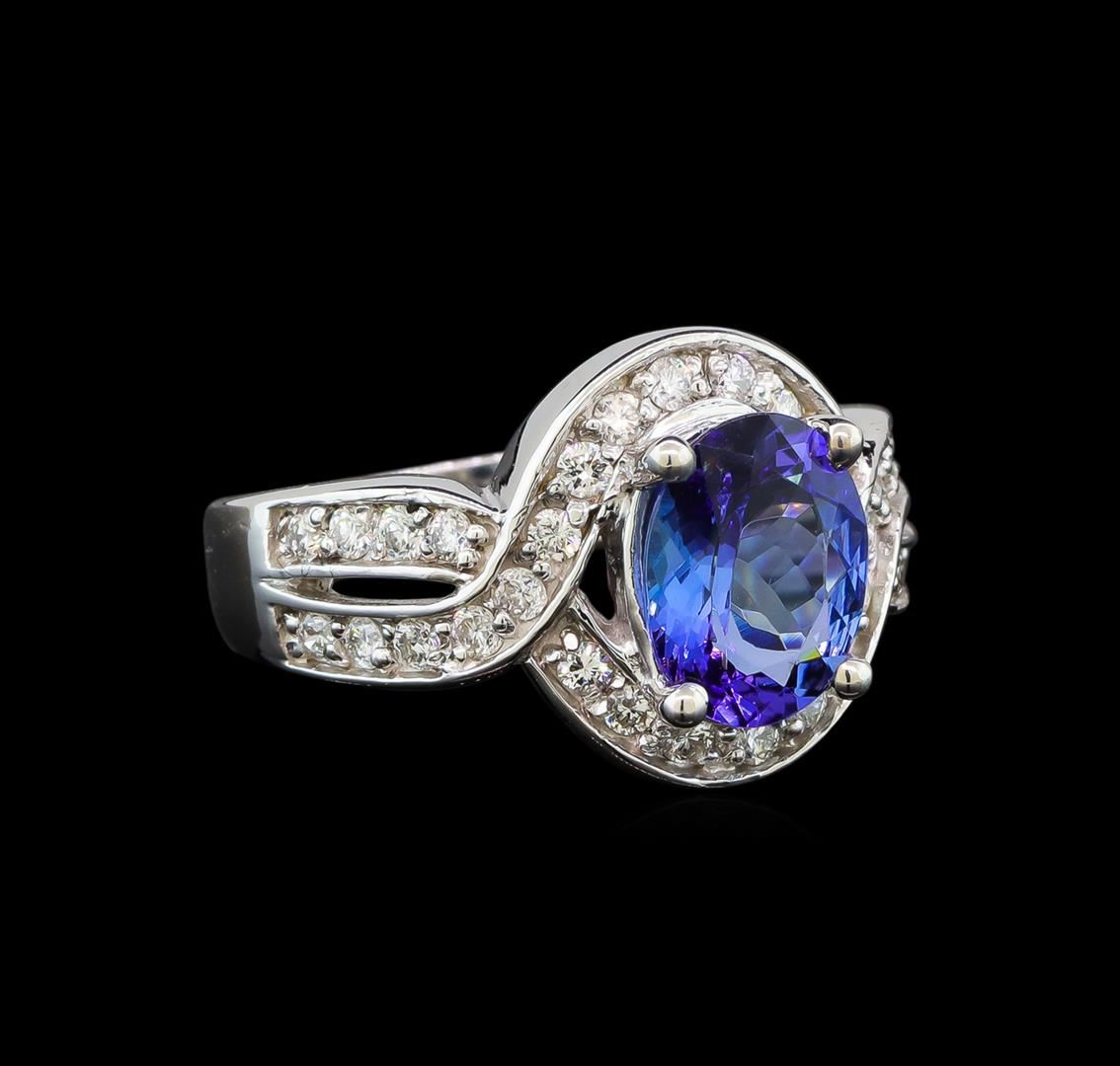 One electronically tested 14KT white gold ladies cast tanzanite and diamond ring with a bright polish finish. Condition is new. Containing: One prong set oval modified brilliant cut natural tanzanite, measuring 9.00 x 7.20 x 4.68mm, approximate weight of 2.13ct., clarity is eye clean, type I, medium light, very slightly grayish, violet color, (GIA V 4/3), cut is good. Thirty-Two prong set round brilliant cut diamonds, measuring 1.50 - 1.50 x 0.90mm (depth est.) approximate total weight of 32 Stones = 0.39ct. Clarity: SI-1 to SI-2. Color: I - J, Cut is Good. Colored gemstones are presumed to have been subjected to commonly used enhancement processes. All diamonds and colored gemstones are graded in the mounting, unless otherwise stated. Total Weight of Colored Stones 2.13ct. Total Weight of Diamonds 0.39ct. Total Weight of Ring 6.40 grams. GGL Appraised at $4,050.00.
