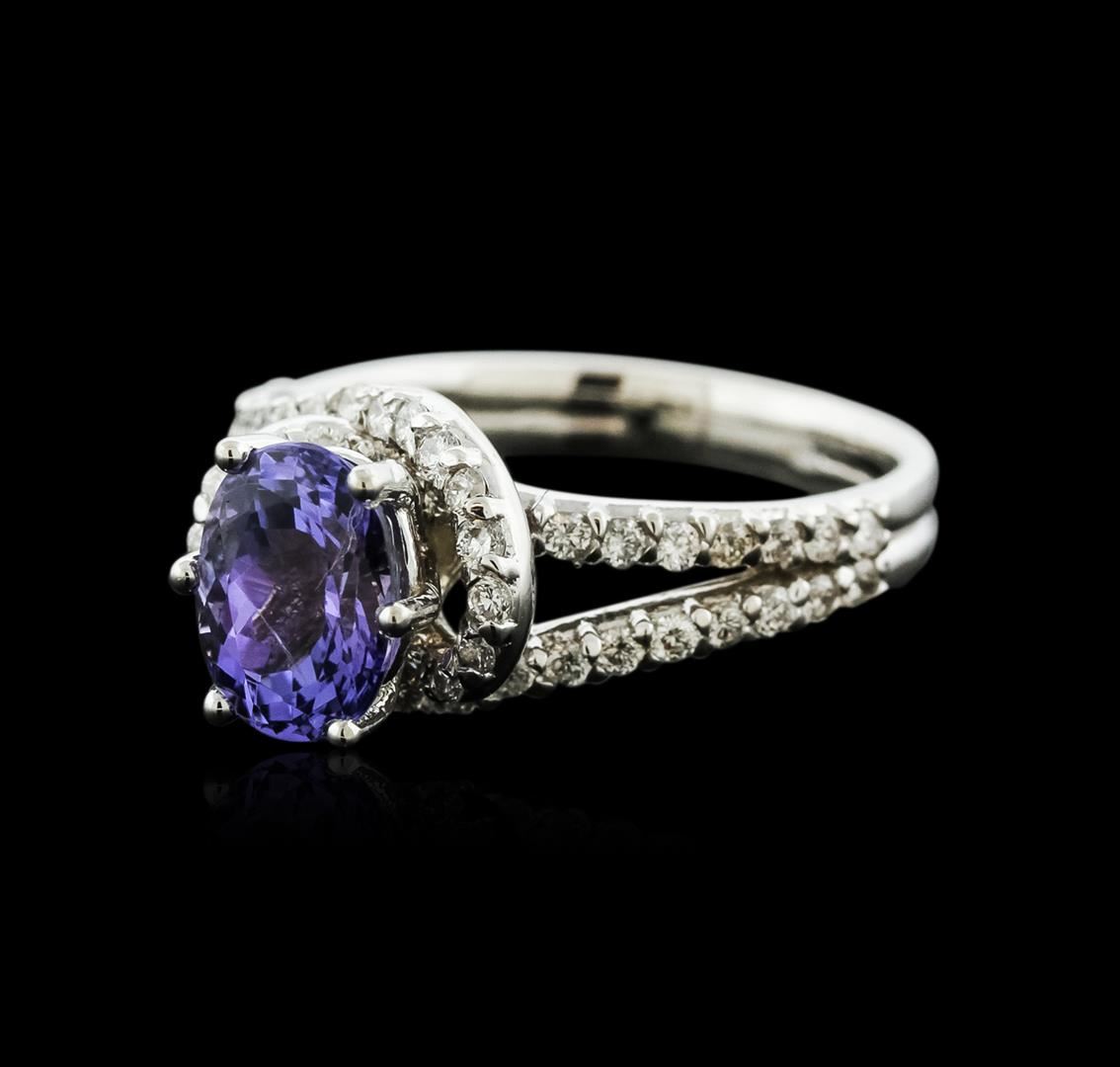 One electronically tested 14KT white gold ladies cast tanzanite and diamond ring with a bright polish finish. Identified with markings of "14K". Condition is new. Containing: One prong set oval modified brilliant cut natural tanzanite, measuring 8.50 x 7.40 x 4.81mm, approximate weight of 2.13ct., clarity is eye clean, type I, medium light, very slightly grayish, violet color, (GIA V 4/3), cut is good. Fifty prong set round brilliant cut diamonds, measuring 1.50 - 1.50 x 0.90mm (depth est.) approximate total weight of 50 Stones = 0.62ct. Clarity: SI-1 to SI-2. Color: I - J, Cut is Good. Colored gemstones are presumed to have been subjected to commonly used enhancement processes. All diamonds and colored gemstones are graded in the mounting, unless otherwise stated. Total Weight of Colored Stones 2.13ct. Total Weight of Diamonds 0.62ct. Total Weight of Ring 5.10 grams. GGL Appraised at $3,495.00.
