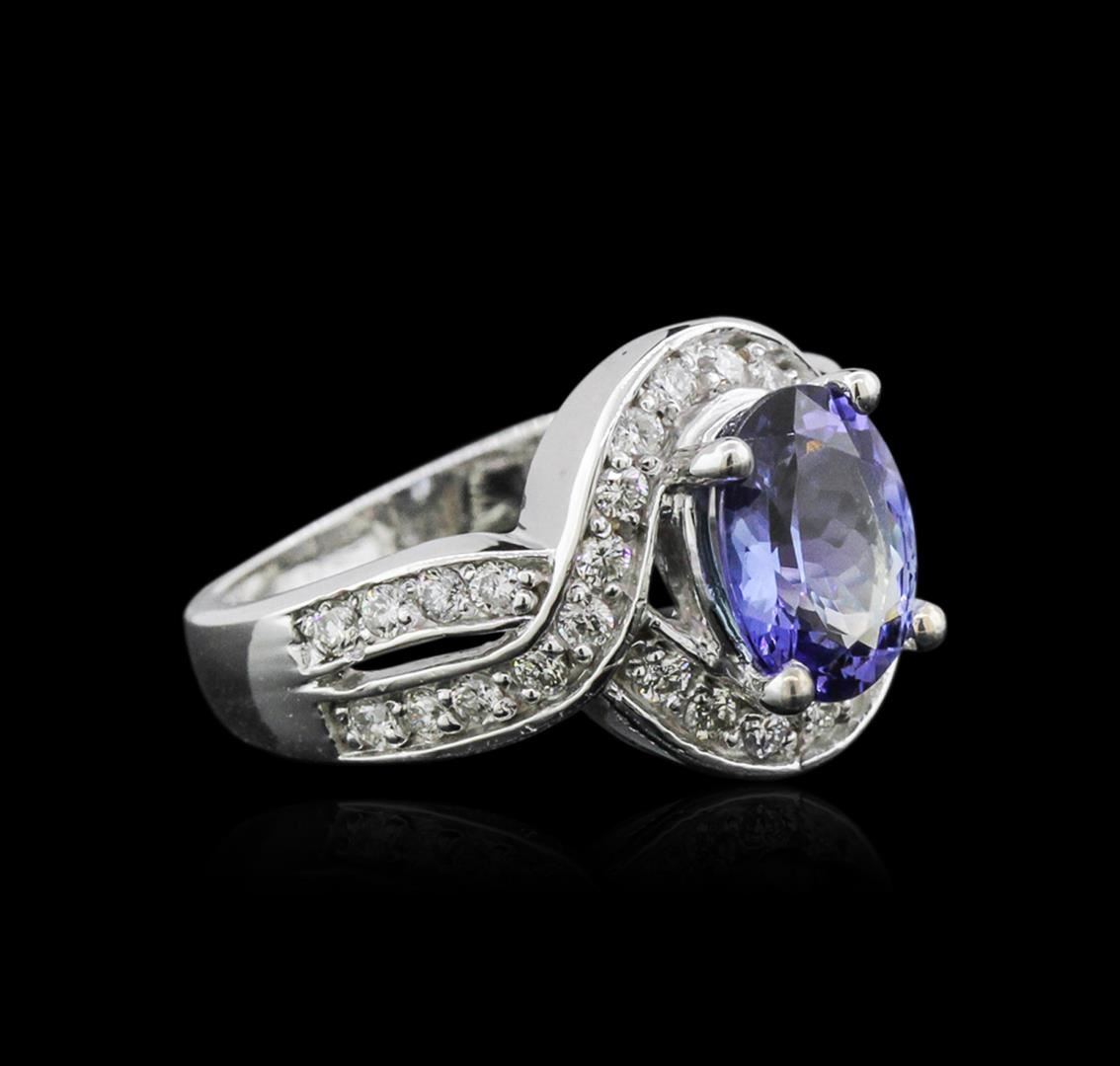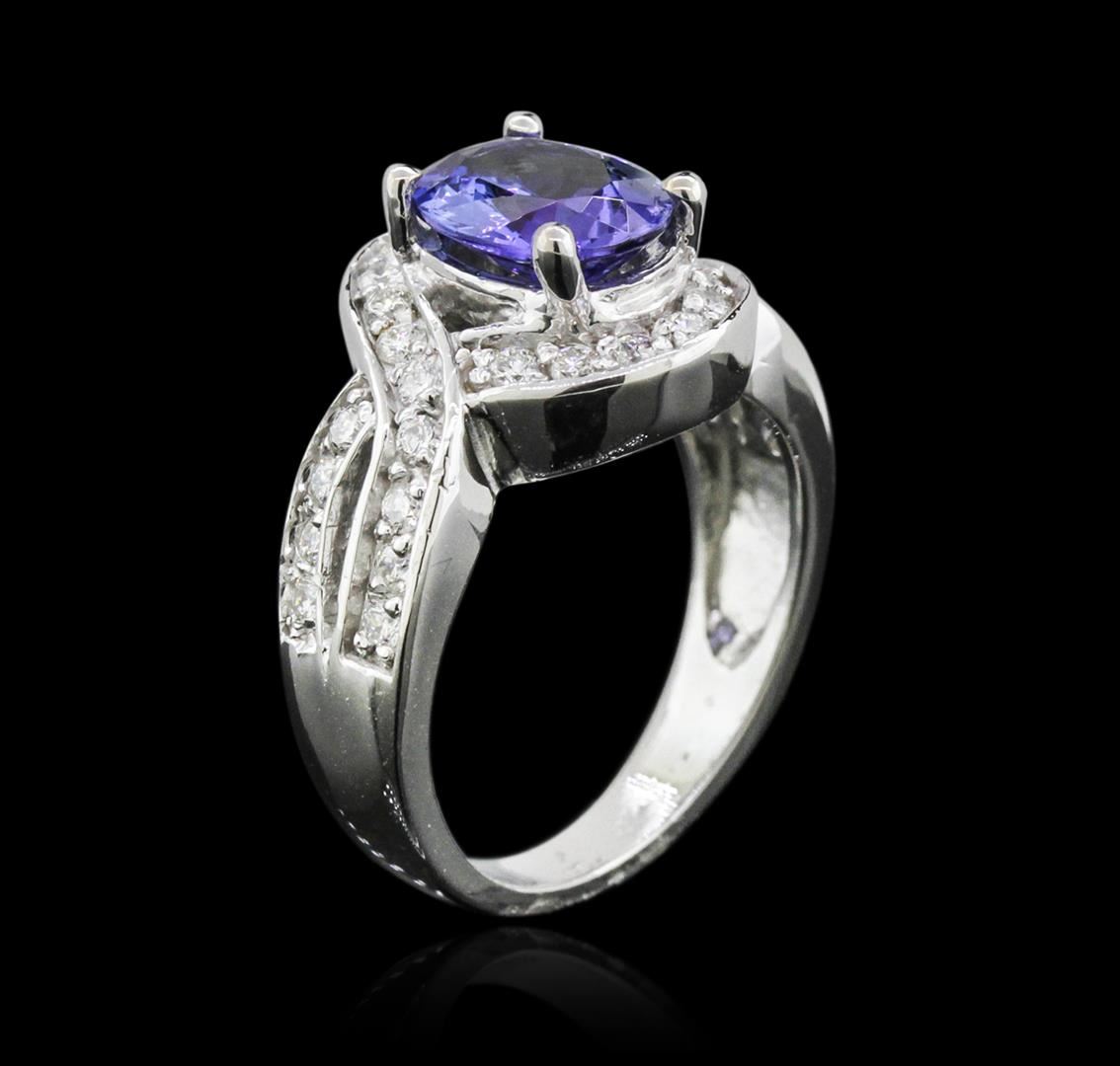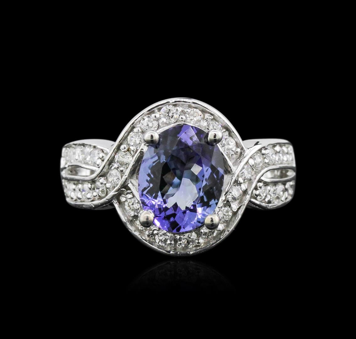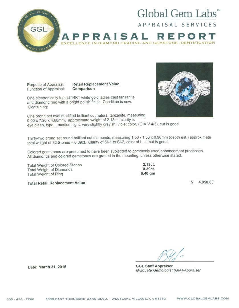 One electronically tested 14KT white gold ladies cast tanzanite and diamond ring with a bright polish finish. Condition is new. Containing: One prong set oval modified brilliant cut natural tanzanite, measuring 9.00 x 7.20 x 4.68mm, approximate weight of 2.13ct., clarity is eye clean, type I, medium light, very slightly grayish, violet color, (GIA V 4/3), cut is good. Thirty-Two prong set round brilliant cut diamonds, measuring 1.50 - 1.50 x 0.90mm (depth est.) approximate total weight of 32 Stones = 0.39ct. Clarity: SI-1 to SI-2. Color: I - J, Cut is Good. Colored gemstones are presumed to have been subjected to commonly used enhancement processes. All diamonds and colored gemstones are graded in the mounting, unless otherwise stated. Total Weight of Colored Stones 2.13ct. Total Weight of Diamonds 0.39ct. Total Weight of Ring 6.40 grams. GGL Appraised at $4,050.00.