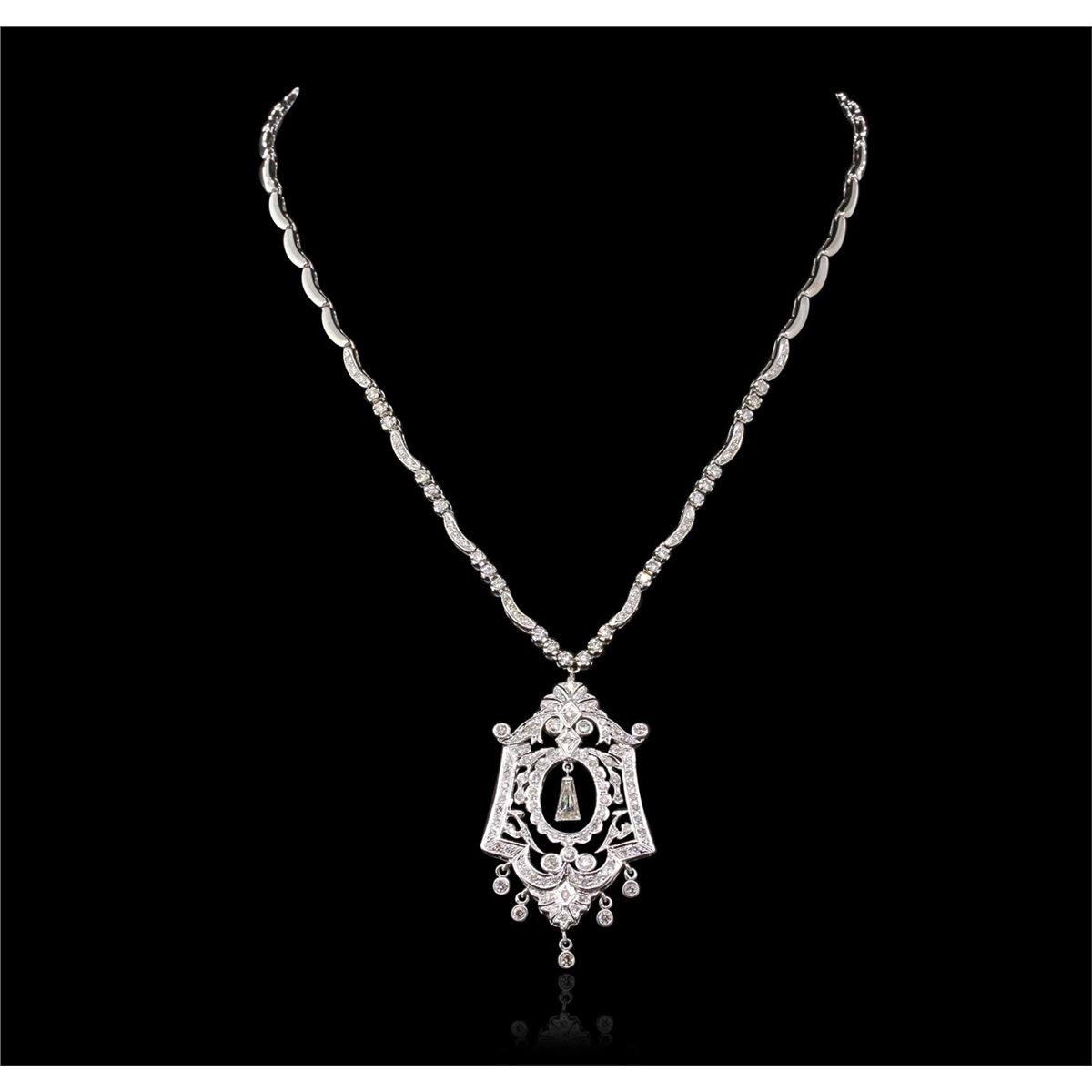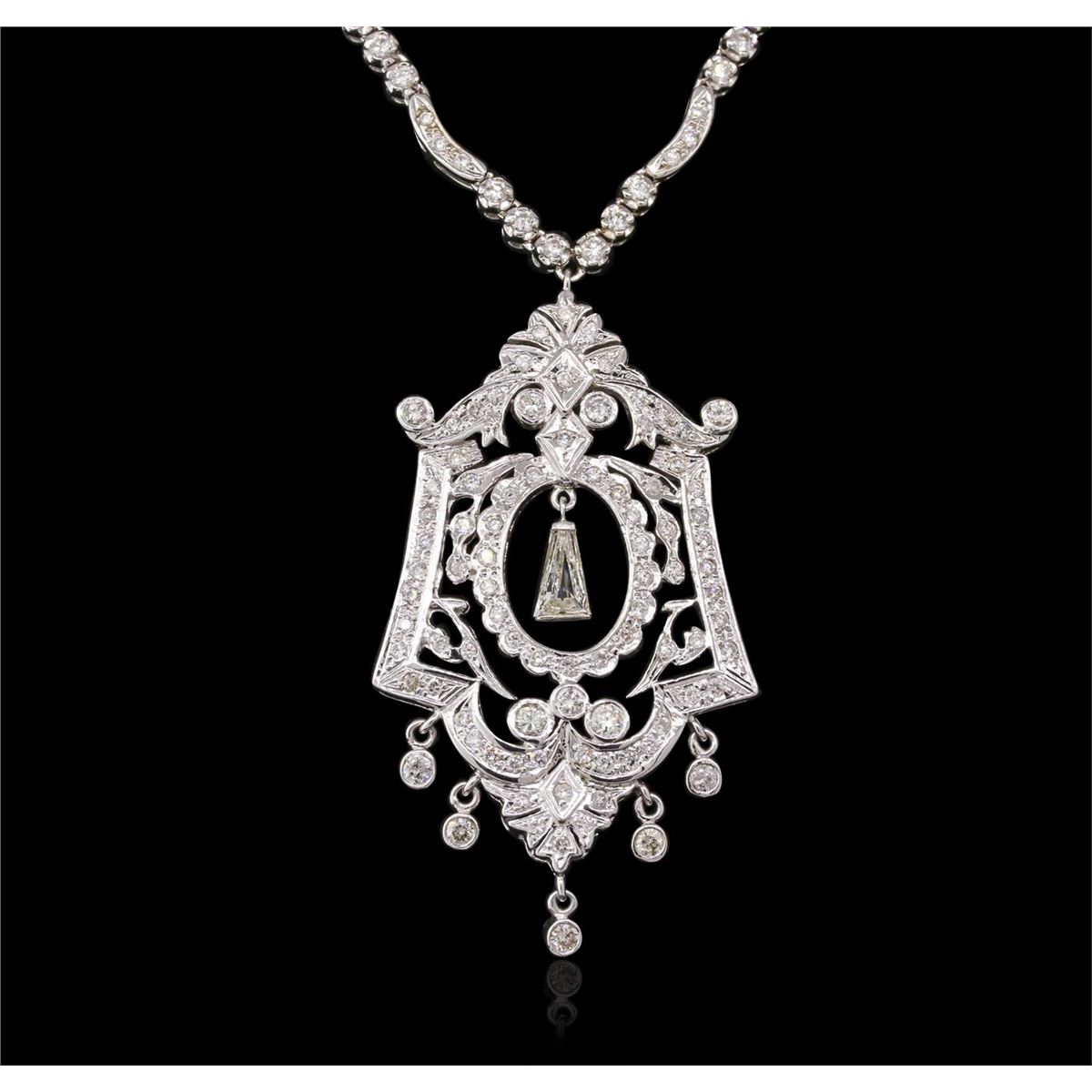 One electronically tested 14KT white gold Ladies combination cast & assembled necklace with a hidden box clasp with a bright polish finish. Condition is new. Measurements: 16" in length. Identified with markings of "14K". Containing: Thirty-Six prong set round brilliant cut diamonds, measuring 2.50 - 2.00 x 1.35mm (depth est.) approximate. Total Weight of 36 Stones = 1.50ct. Clarity: SI-2 to I-1. Color: I - J, Cut is Good. One Hundred One prong set round brilliant cut diamonds, measuring 1.20 - 1.20 x 0.72mm (depth est.) approximate. Total Weight of 101 Stones = 0.64ct. Clarity: I-1 to I-2. Color: I - J, Cut is Good. Total Weight of Diamonds 2.13ct. Total Weight of Necklace 26.50 grams. GGL Appraised at $14,690.00.