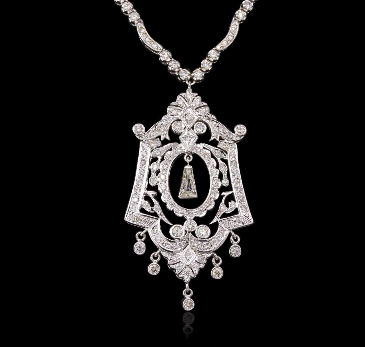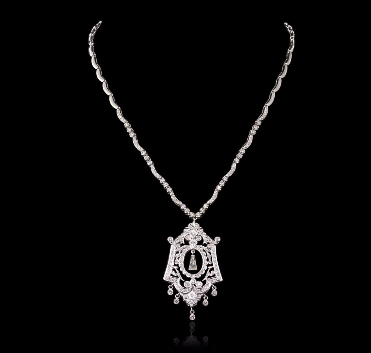 One electronically tested 14KT white gold Ladies combination cast & assembled necklace with a hidden box clasp with a bright polish finish. Condition is new. Measurements: 16" in length. Identified with markings of "14K". Containing: Thirty-Six prong set round brilliant cut diamonds, measuring 2.50 - 2.00 x 1.35mm (depth est.) approximate. Total Weight of 36 Stones = 1.50ct. Clarity: SI-2 to I-1. Color: I - J, Cut is Good. One Hundred One prong set round brilliant cut diamonds, measuring 1.20 - 1.20 x 0.72mm (depth est.) approximate. Total Weight of 101 Stones = 0.64ct. Clarity: I-1 to I-2. Color: I - J, Cut is Good. Total Weight of Diamonds 2.13ct. Total Weight of Necklace 26.50 grams. GGL Appraised at $14,690.00.