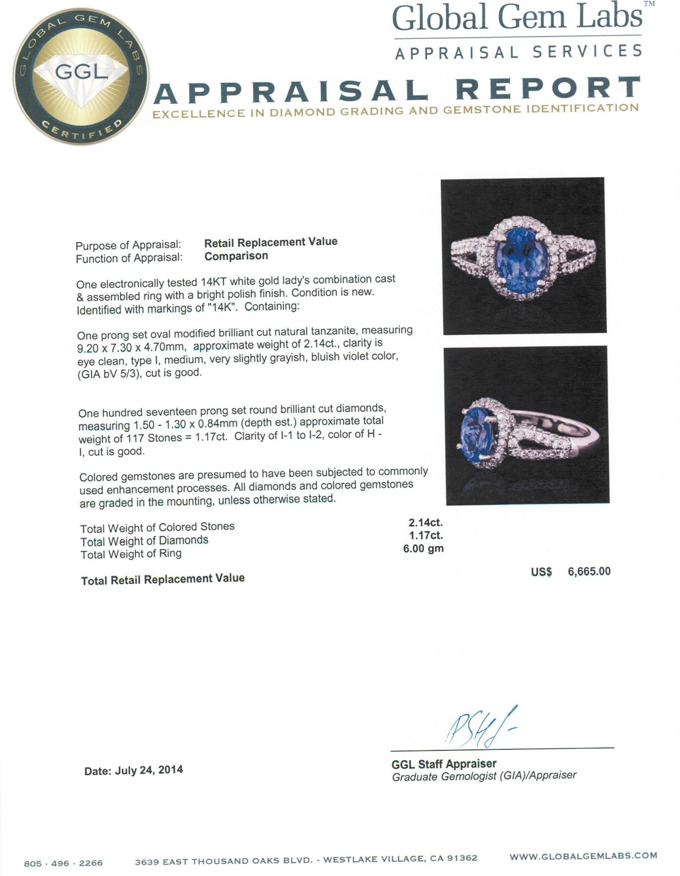 One electronically tested 14KT white gold ladies combination cast & assembled ring with a bright polish finish. Condition is new. Identified with markings of "14K". Containing: One prong set oval modified brilliant cut natural tanzanite, measuring 9.20 x 7.30 x 4.70mm, approximate weight of 2.14ct., clarity is eye clean, type I, medium, very slightly grayish, bluish violet color, (GIA bV 5/3), cut is good. One Hundred Seventeen prong set round brilliant cut diamonds, measuring 1.50 - 1.30 x 0.84mm (depth est.) approximate total weight of 117 Stones = 1.17ct. Clarity: I-1 to I-2. Color: H - I, Cut is Good. Colored gemstones are presumed to have been subjected to commonly used enhancement processes. All diamonds and colored gemstones are graded in the mounting, unless otherwise stated. Total Weight of Colored Stones 2.14ct. Total Weight of Diamonds 1.17ct. Total Weight of Ring 6.00 grams. GGL Appraised.