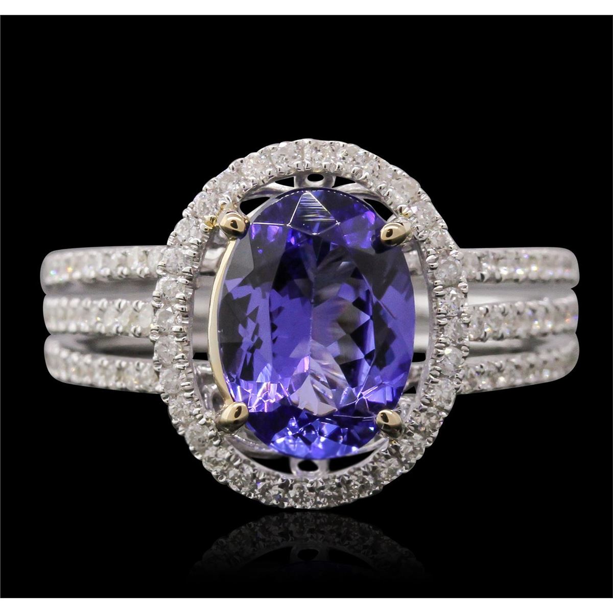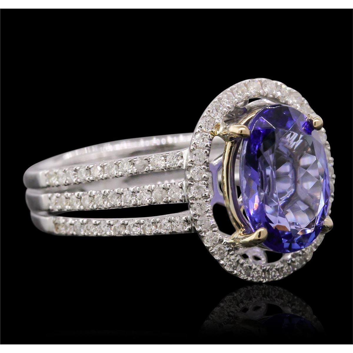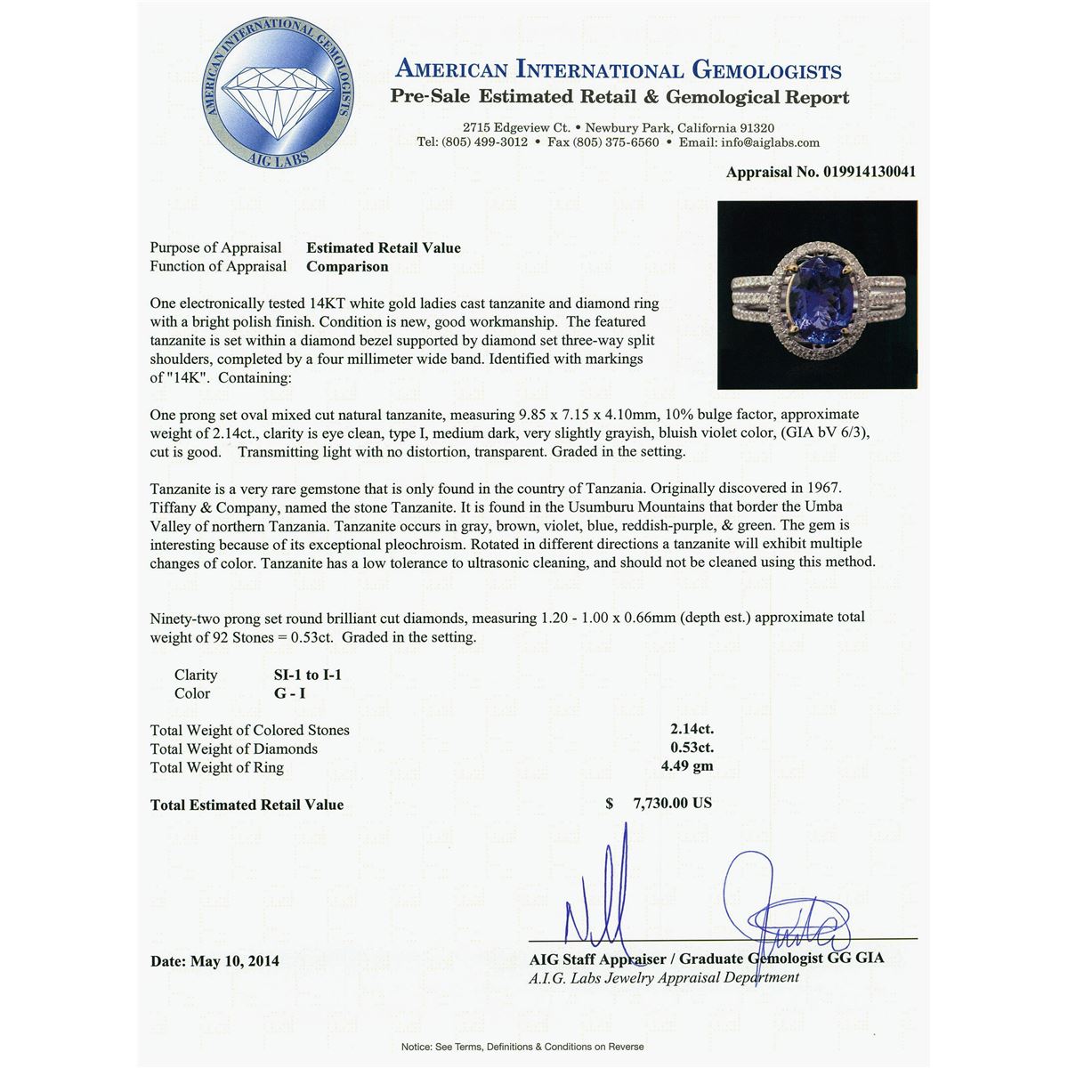 One electronically tested 14KT white gold ladies cast tanzanite and diamond ring with a bright polish finish. Condition is new, good workmanship. The featured tanzanite is set within a diamond bezel supported by diamond set three-way split shoulders, completed by a four millimeter wide band. Identified with markings of "14K". Containing: One prong set oval mixed cut natural tanzanite, measuring 9.85 x 7.15 x 4.10mm, 10%. bulge factor, approximate weight of 2.14ct., clarity is eye clean, type I, medium dark, very slightly grayish, bluish violet color, (GIA bV 6/3), cut is good. Transmitting light with no distortion, transparent. Graded in the setting. Tanzanite is a very rare gemstone that is only found in the country of Tanzania. Originally discovered in 1967. Tiffany & Company, named the stone Tanzanite. It is found in the Usumburu Mountains that border the Umba Valley of northern Tanzania. Tanzanite occurs in gray, brown, violet, blue, reddish-purple, & green. The gem is interesting because of its exceptional pleochroism. Rotated in different directions a tanzanite will exhibit multiple changes of color. Tanzanite has a low tolerance to ultrasonic cleaning, and should not be cleaned using this method. Ninety-Two prong set round brilliant cut diamonds, measuring 1.20 - 1.00 x 0.66mm (depth est.) approximate. Total Weight of 92 Stones = 0.53ct. Graded in the setting. Clarity: SI-1 to I-1. Color: G - I. Total Weight of Colored Stones 2.14ct. Total Weight of Diamonds 0.53ct. Total Weight of Ring 4.49grams. AIG Appraised at $7,730.00.