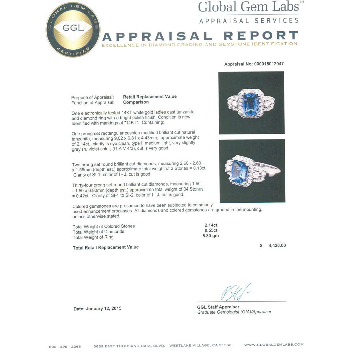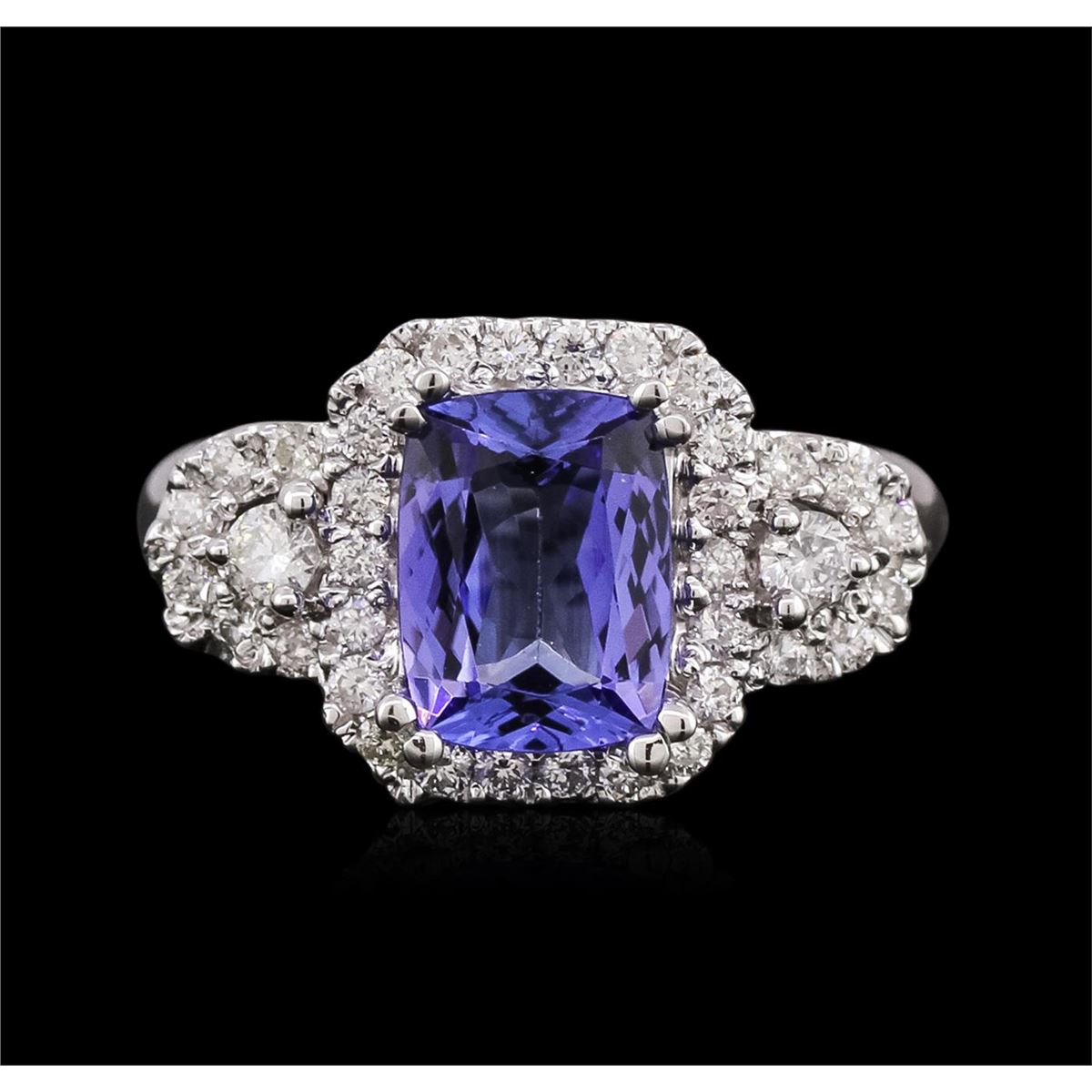 One electronically tested 14KT white gold ladies cast tanzanite and diamond ring with a bright polish finish. Identified with markings of "14KT". Condition is new. Containing: One prong set rectangular cushion modified brilliant cut natural tanzanite, measuring 9.02 x 6.81 x 4.43mm, approximate weight of 2.14ct., clarity is eye clean, type I, medium light, very slightly grayish, violet color, (GIA V 4/3), cut is very good. Two prong set round brilliant cut diamonds, measuring 2.60 - 2.60 x 1.56mm (depth est.) approximate total weight of 2 Stones = 0.13ct. Clarity: SI-1. Color: I - J, Cut is Good. Thirty-Four prong set round brilliant cut diamonds, measuring 1.50 - 1.50 x 0.90mm (depth est.) approximate total weight of 34 Stones = 0.42ct. Clarity: SI-1 to SI-2. Color: I - J, Cut is Good. Colored gemstones are presumed to have been subjected to commonly used enhancement processes. All diamonds and colored gemstones are graded in the mounting, unless otherwise stated. Total Weight of Colored Stones 2.14ct. Total Weight of Diamonds 0.55ct. Total Weight of Ring 5.80 grams. GGL Appraised at $4,420.00.