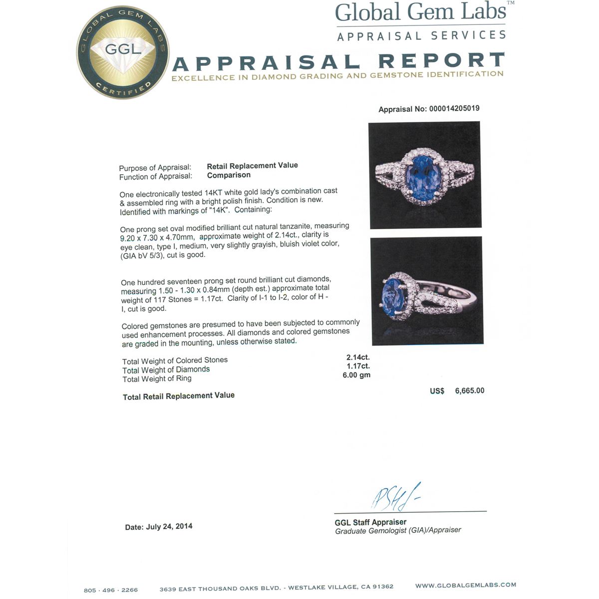 One electronically tested 14KT white gold ladies combination cast & assembled ring with a bright polish finish. Condition is new. Identified with markings of "14K". Containing: One prong set oval modified brilliant cut natural tanzanite, measuring 9.20 x 7.30 x 4.70mm, approximate weight of 2.14ct., clarity is eye clean, type I, medium, very slightly grayish, bluish violet color, (GIA bV 5/3), cut is good. One Hundred Seventeen prong set round brilliant cut diamonds, measuring 1.50 - 1.30 x 0.84mm (depth est.) approximate total weight of 117 Stones = 1.17ct. Clarity: I-1 to I-2. Color: H - I, Cut is Good. Colored gemstones are presumed to have been subjected to commonly used enhancement processes. All diamonds and colored gemstones are graded in the mounting, unless otherwise stated. Total Weight of Colored Stones 2.14ct. Total Weight of Diamonds 1.17ct. Total Weight of Ring 6.00 grams. GGL Appraised at $6,665.00.