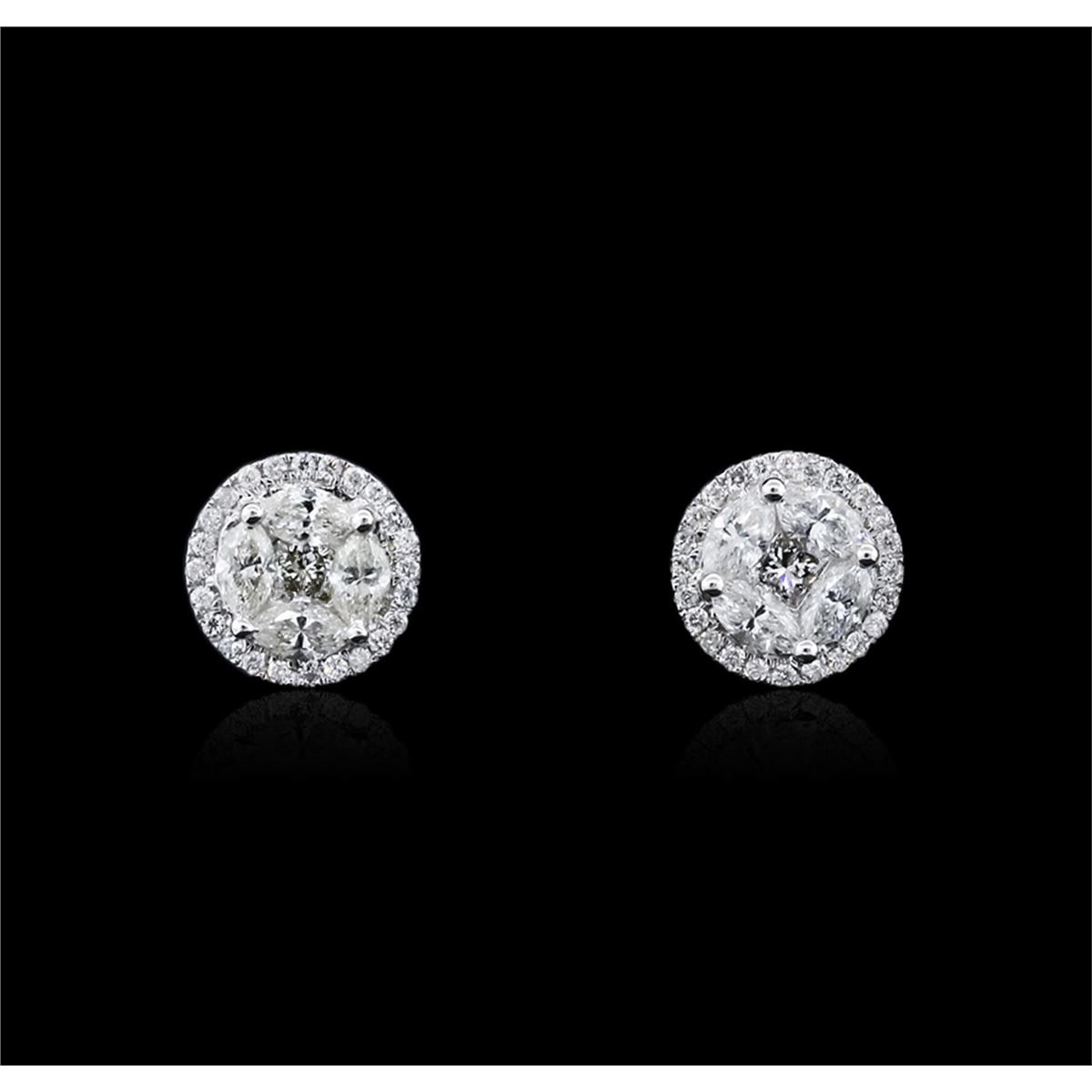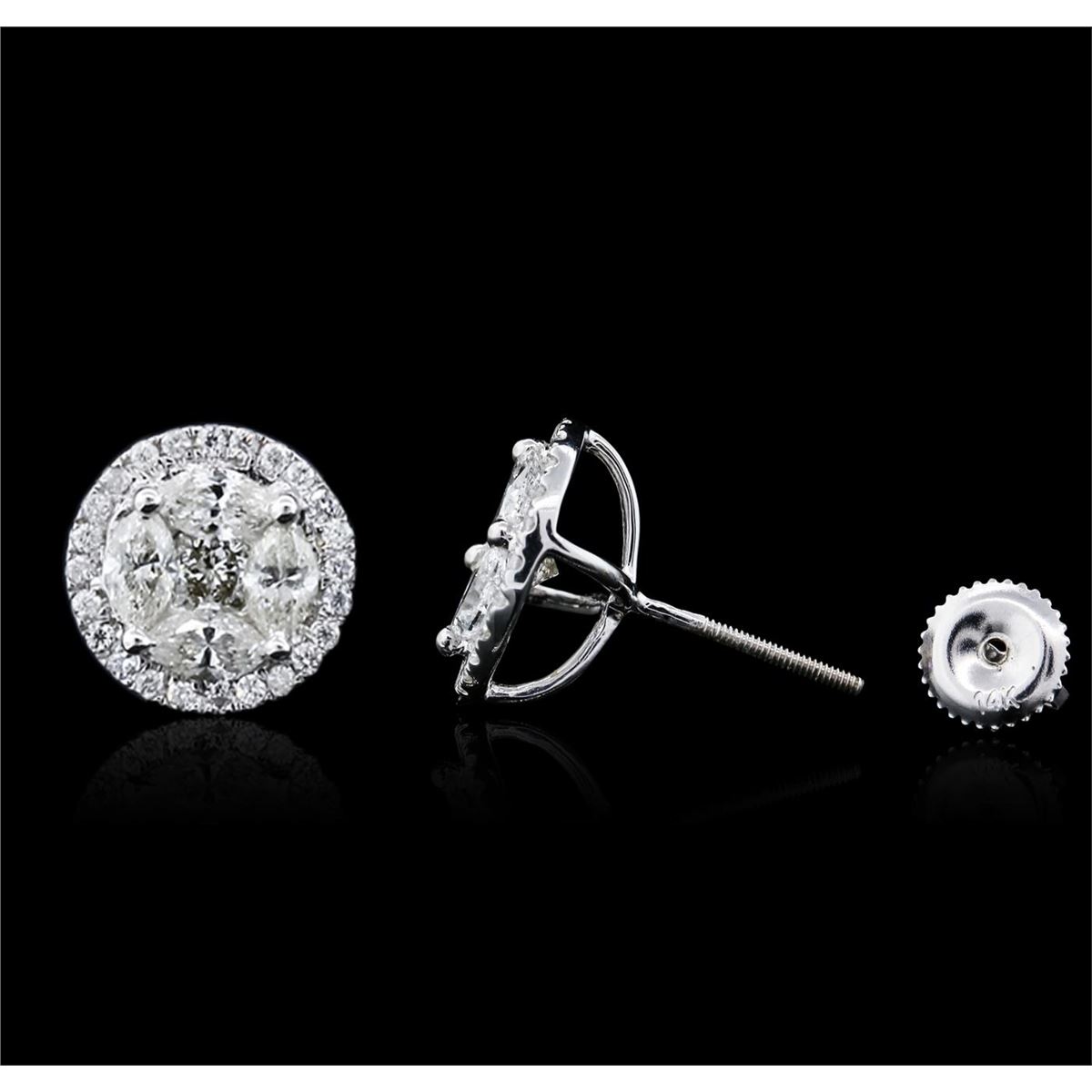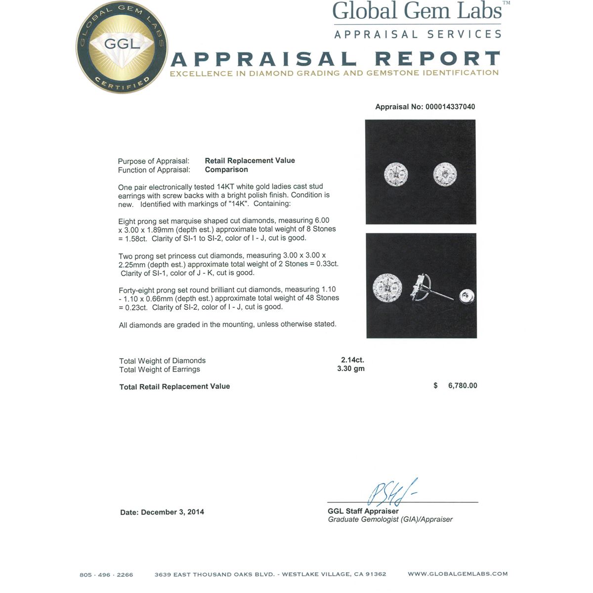 One pair electronically tested 14KT white gold ladies cast stud earrings with screw backs with a bright polish finish. Identified with markings of "14K". Condition is new. Containing: Eight prong set marquise shaped cut diamonds, measuring 6.00 x 3.00 x 1.89mm (depth est.) approximate total weight of 8 Stones = 1.58ct. Clarity: SI-1 to SI-2. Color: I - J, Cut is Good. Two prong set princess cut diamonds, measuring 3.00 x 3.00 x 2.25mm (depth est.) approximate total weight of 2 Stones = 0.33ct. Clarity: SI-1. Color: J - K, Cut is Good. Forty-Eight prong set round brilliant cut diamonds, measuring 1.10 - 1.10 x 0.66mm (depth est.) approximate total weight of 48 Stones = 0.23ct. Clarity: SI-2. Color: I - J, Cut is Good. All diamonds are graded in the mounting, unless otherwise stated. Total Weight of Diamonds 2.14ct. Total Weight of Earrings 3.30 grams. GGL Appraised at $6,780.00.
