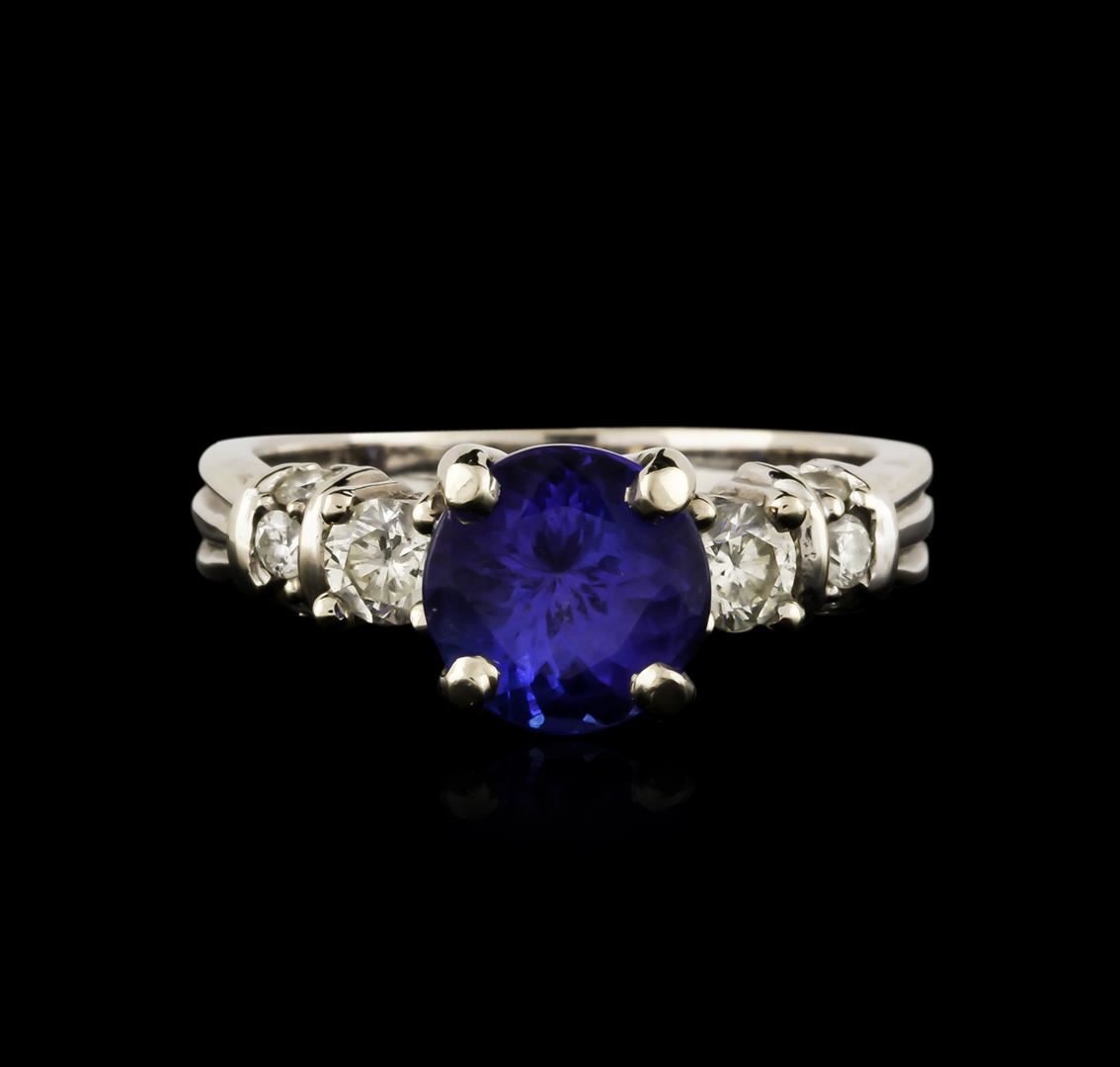 One electronically tested 14KT white gold ladies cast tanzanite and diamond ring with a bright polish finish. The featured tanzanite is supported by diamond set shoulders, completed by a two and one-half millimeter wide band. Identified with markings of "14K". Condition is new, good workmanship. Containing: One prong set round brilliant cut natural tanzanite, measuring 7.75 - 7.80 x 5.30 mm, approximate weight of 2.15ct., clarity is eye clean, type I, medium dark, moderately strong, violetish blue color, (GIA vB 6/4), cut is good. Transmitting light with no distortion, transparent. Graded in the setting. Tanzanite is a very rare gemstone that is only found in the country of Tanzania. Originally discovered in 1967. Tiffany & Company, named the stone Tanzanite. It is found in the Usumburu Mountains that border the Umba Valley of northern Tanzania. Tanzanite occurs in gray, brown, violet, blue, reddish-purple, & green. The gem is interesting because of its exceptional pleochroism. Rotated in different directions a tanzanite will exhibit multiple changes of color. Tanzanite has a low tolerance to ultrasonic cleaning, and should not be cleaned using this method. Two prong set round brilliant cut diamonds, measuring 3.70 - 3.70 x 2.22mm (depth est.) approximate total weight of 2 Stones = 0.37ct. Graded in the setting. Clarity: SI-1. Color: H - I Six prong set round brilliant cut diamonds, measuring 2.20 - 1.90 x 1.23mm (depth est.) approximate total weight of 6 Stones = 0.19ct. Graded in the setting. Clarity: VS-2 to SI-1. Color: H - J. Total Weight of Colored Stones 2.15ct. Total Weight of Diamonds 0.56ct. Total Weight of Ring 5.74 grams. AIG Appraised at $7,695.00.