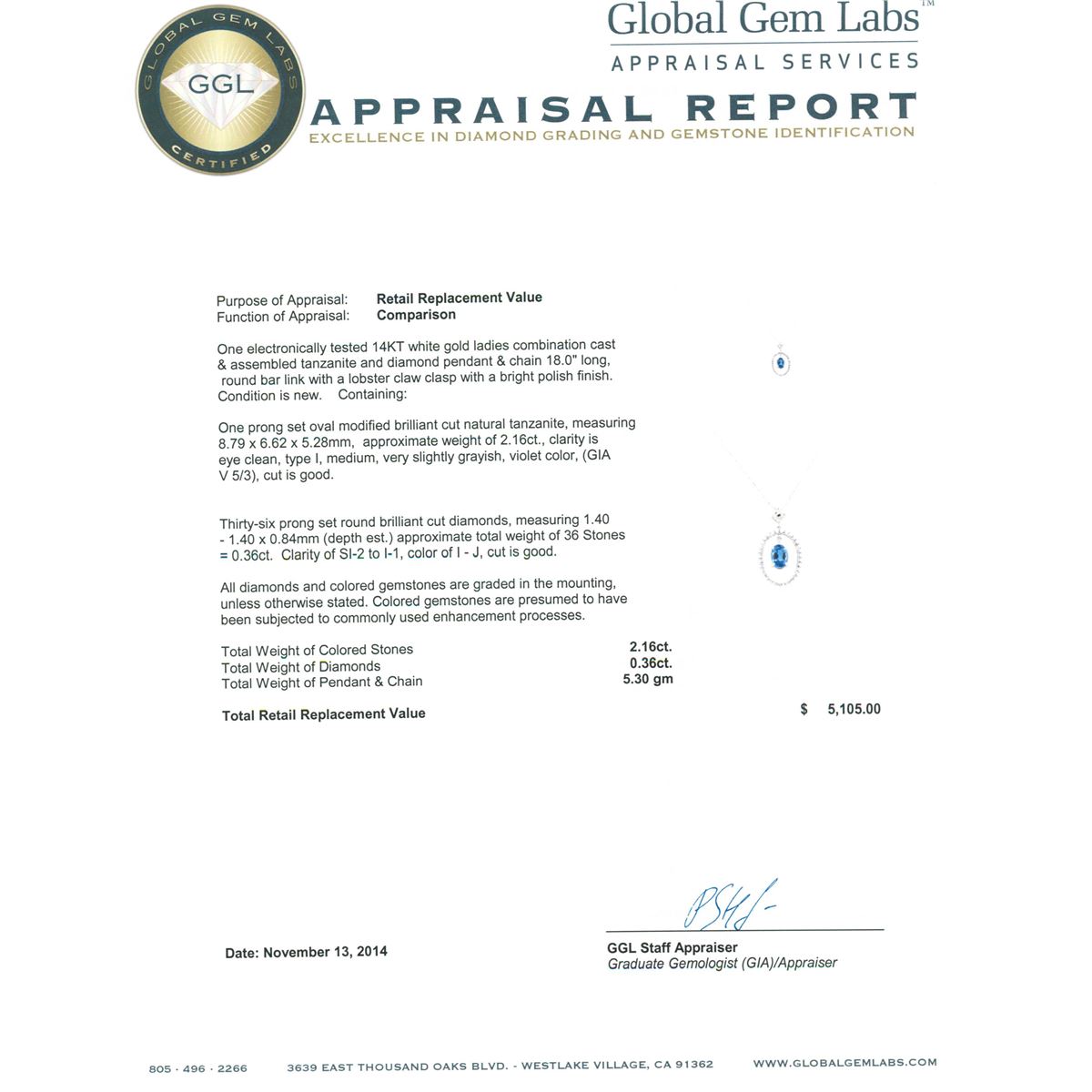 One electronically tested 14KT white gold ladies combination cast & assembled tanzanite and diamond pendant & chain 18.0" long, round bar link with a lobster claw clasp with a bright polish finish. Condition is new. Containing: One prong set oval modified brilliant cut natural tanzanite, measuring 8.79 x 6.62 x 5.28mm, approximate weight of 2.16ct., clarity is eye clean, type I, medium, very slightly grayish, violet color, (GIA V 5/3), cut is good. Thirty-Six prong set round brilliant cut diamonds, measuring 1.40 - 1.40 x 0.84mm (depth est.) approximate total weight of 36 Stones = 0.36ct. Clarity: SI-2 to I-1. Color: I - J, Cut is Good. All diamonds and colored gemstones are graded in the mounting, unless otherwise stated. Colored gemstones are presumed to have been subjected to commonly used enhancement processes. Total Weight of Colored Stones 2.16ct. Total Weight of Diamonds 0.36ct. Total Weight of Pendant & Chain 5.30 grams. GGL Appraised at $5,105.00.