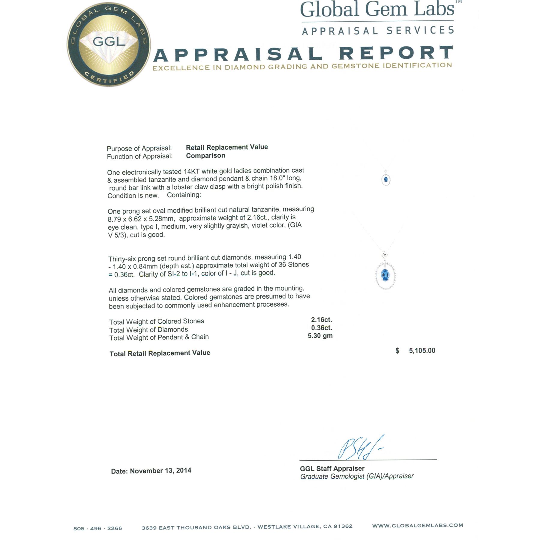 One electronically tested 14KT white gold ladies combination cast & assembled tanzanite and diamond pendant & chain 18.0" long, round bar link with a lobster claw clasp with a bright polish finish. Condition is new. Containing: One prong set oval modified brilliant cut natural tanzanite, measuring 8.79 x 6.62 x 5.28mm, approximate weight of 2.16ct., clarity is eye clean, type I, medium, very slightly grayish, violet color, (GIA V 5/3), cut is good. Thirty-Six prong set round brilliant cut diamonds, measuring 1.40 - 1.40 x 0.84mm (depth est.) approximate total weight of 36 Stones = 0.36ct. Clarity: SI-2 to I-1. Color: I - J, Cut is Good. All diamonds and colored gemstones are graded in the mounting, unless otherwise stated. Colored gemstones are presumed to have been subjected to commonly used enhancement processes. Total Weight of Colored Stones 2.16ct. Total Weight of Diamonds 0.36ct. Total Weight of Pendant & Chain 5.30 grams. GGL Appraised at $5,105.00.