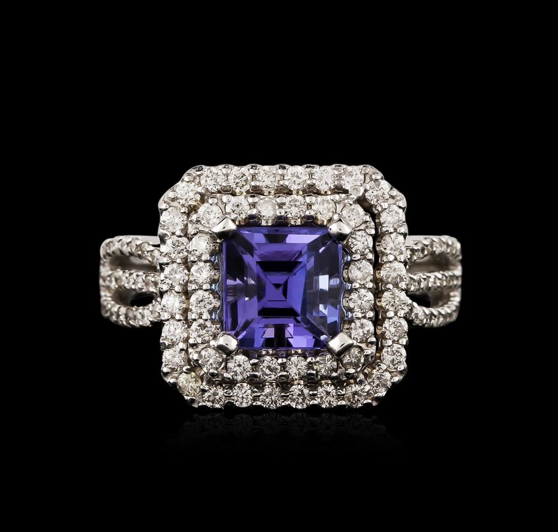 One electronically tested 14KT white gold ladies cast tanzanite and diamond ring with a bright polish finish. Identified with markings of "14K". Condition is new. Containing: One prong set emerald standard step cut natural tanzanite, measuring 6.55 x 6.50 x 5.60mm, approximate weight of 2.16ct., clarity is eye clean, type I, medium light, very slightly grayish, violet color, (GIA V 4/3), cut is good. Seventy-Eight prong set round brilliant cut diamonds, measuring 1.30 - 1.10 x 0.72mm (depth est.) approximate total weight of 78 Stones = 0.49ct. Clarity of SI-2 to I-2, Color of I - J, Cut is Good. Colored gemstones are presumed to have been subjected to commonly used enhancement processes. All diamonds and colored gemstones are graded in the mounting, unless otherwise stated. Total Weight of Colored Stones 2.16ct. Total Weight of Diamonds 0.49ct. Total Weight of Ring 5.50 grams. GGL Appraised at $4,225.00.
