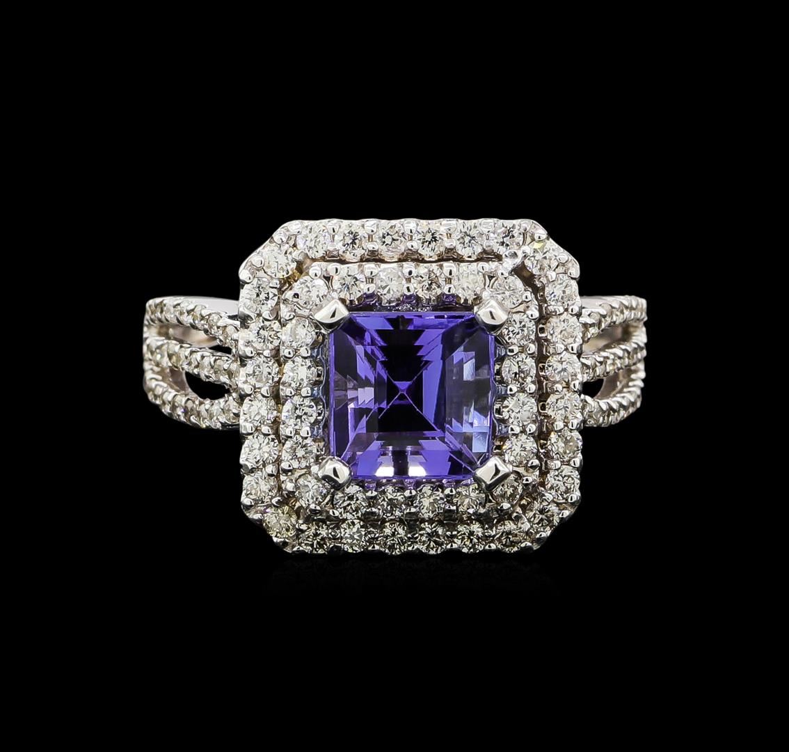 One electronically tested 14KT white gold ladies cast tanzanite and diamond ring with a bright polish finish. Identified with markings of "14K". Condition is new. Containing: One prong set emerald standard step cut natural tanzanite, measuring 6.55 x 6.50 x 5.60mm, approximate weight of 2.16ct., clarity is eye clean, type I, medium light, very slightly grayish, violet color, (GIA V 4/3), cut is good. Seventy-Eight prong set round brilliant cut diamonds, measuring 1.30 - 1.10 x 0.72mm (depth est.) approximate total weight of 78 Stones = 0.49ct. Clarity of SI-2 to I-2, Color of I - J, Cut is Good. Colored gemstones are presumed to have been subjected to commonly used enhancement processes. All diamonds and colored gemstones are graded in the mounting, unless otherwise stated. Total Weight of Colored Stones 2.16ct. Total Weight of Diamonds 0.49ct. Total Weight of Ring 5.50 grams. GGL Appraised at $4,225.00.