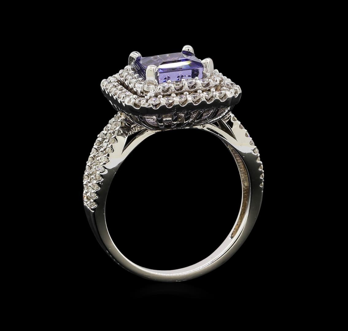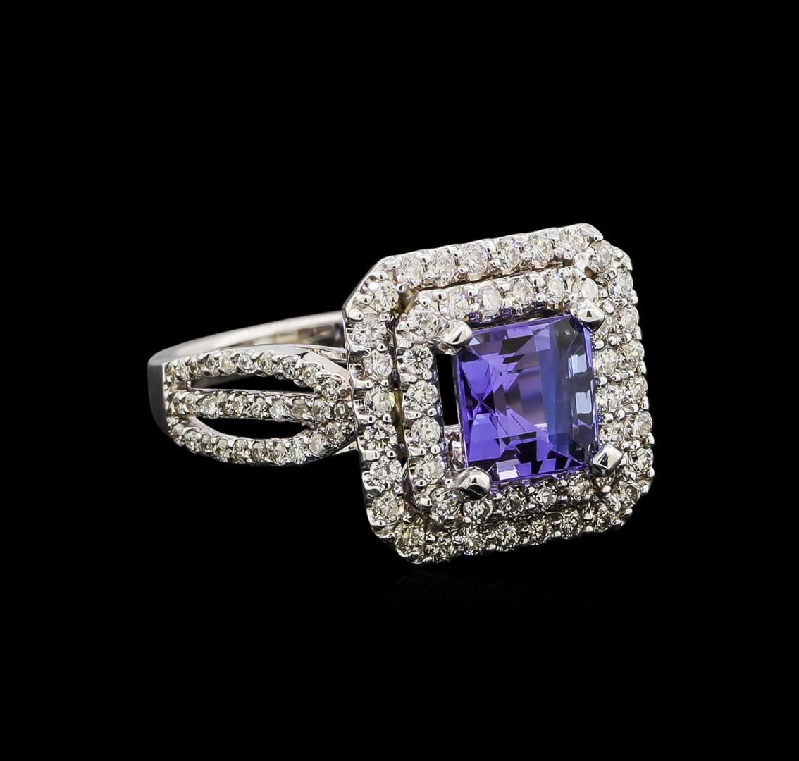 One electronically tested 14KT white gold ladies cast tanzanite and diamond ring with a bright polish finish. Identified with markings of "14K". Condition is new. Containing: One prong set emerald standard step cut natural tanzanite, measuring 6.55 x 6.50 x 5.60mm, approximate weight of 2.16ct., clarity is eye clean, type I, medium light, very slightly grayish, violet color, (GIA V 4/3), cut is good. Seventy-Eight prong set round brilliant cut diamonds, measuring 1.30 - 1.10 x 0.72mm (depth est.) approximate total weight of 78 Stones = 0.49ct. Clarity of SI-2 to I-2, Color of I - J, Cut is Good. Colored gemstones are presumed to have been subjected to commonly used enhancement processes. All diamonds and colored gemstones are graded in the mounting, unless otherwise stated. Total Weight of Colored Stones 2.16ct. Total Weight of Diamonds 0.49ct. Total Weight of Ring 5.50 grams. GGL Appraised at $4,225.00.