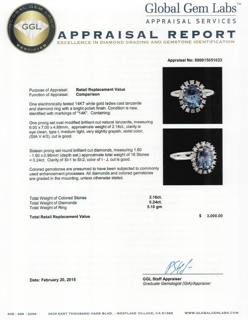 One electronically tested 14KT white gold ladies cast tanzanite and diamond ring with a bright polish finish. Identified with markings of "14K". Condition is new. Containing: One prong set oval modified brilliant cut natural tanzanite, measuring 9.00 x 7.00 x 4.88mm, approximate weight of 2.16ct., clarity is eye clean, type I, medium light, very slightly grayish, violet color, (GIA V 4/3), cut is good. Sixteen prong set round brilliant cut diamonds, measuring 1.60 - 1.60 x 0.96mm (depth est.) approximate total weight of 16 Stones = 0.24ct. Clarity: SI-1 to SI-2. Color: I - J, Cut is Good. Colored gemstones are presumed to have been subjected to commonly used enhancement processes. All diamonds and colored gemstones are graded in the mounting, unless otherwise stated. Total Weight of Colored Stones 2.16ct. Total Weight of Diamonds 0.24ct. Total Weight of Ring 5.10 grams. GGL Appraised at $3,000.00.