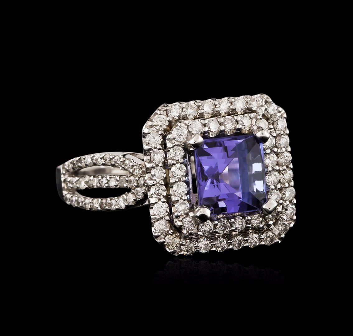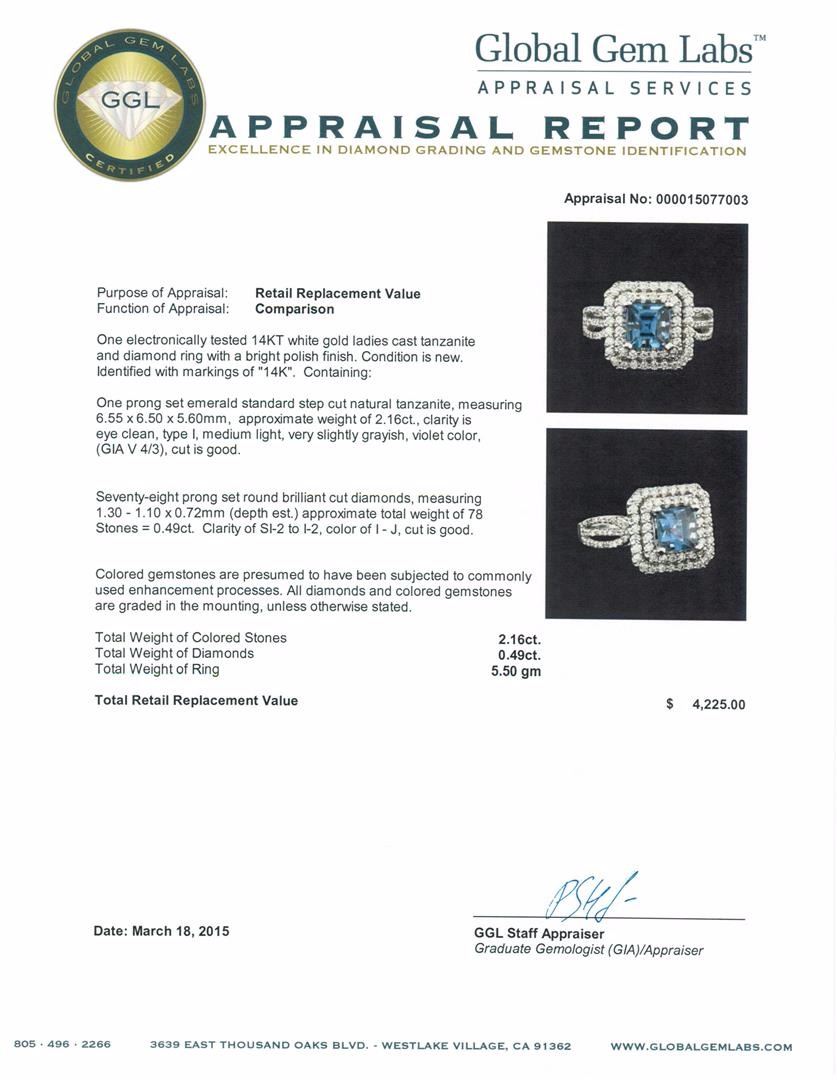 One electronically tested 14KT white gold ladies cast tanzanite and diamond ring with a bright polish finish. Identified with markings of "14K". Condition is new. Containing: One prong set emerald standard step cut natural tanzanite, measuring 6.55 x 6.50 x 5.60mm, approximate weight of 2.16ct., clarity is eye clean, type I, medium light, very slightly grayish, violet color, (GIA V 4/3), cut is good. Seventy-Eight prong set round brilliant cut diamonds, measuring 1.30 - 1.10 x 0.72mm (depth est.) approximate total weight of 78 Stones = 0.49ct. Clarity of SI-2 to I-2, Color of I - J, Cut is Good. Colored gemstones are presumed to have been subjected to commonly used enhancement processes. All diamonds and colored gemstones are graded in the mounting, unless otherwise stated. Total Weight of Colored Stones 2.16ct. Total Weight of Diamonds 0.49ct. Total Weight of Ring 5.50 grams. GGL Appraised at $4,225.00.