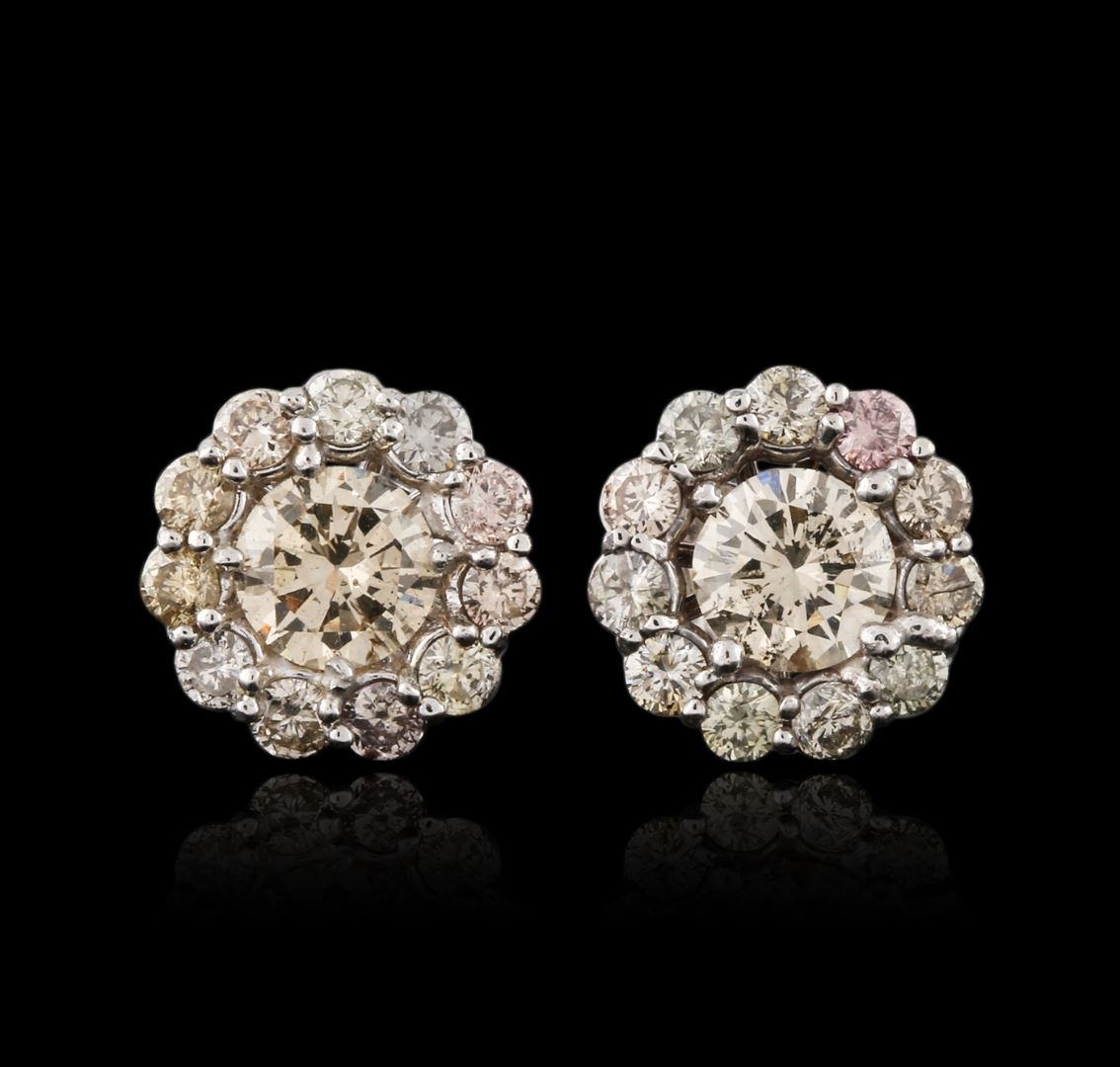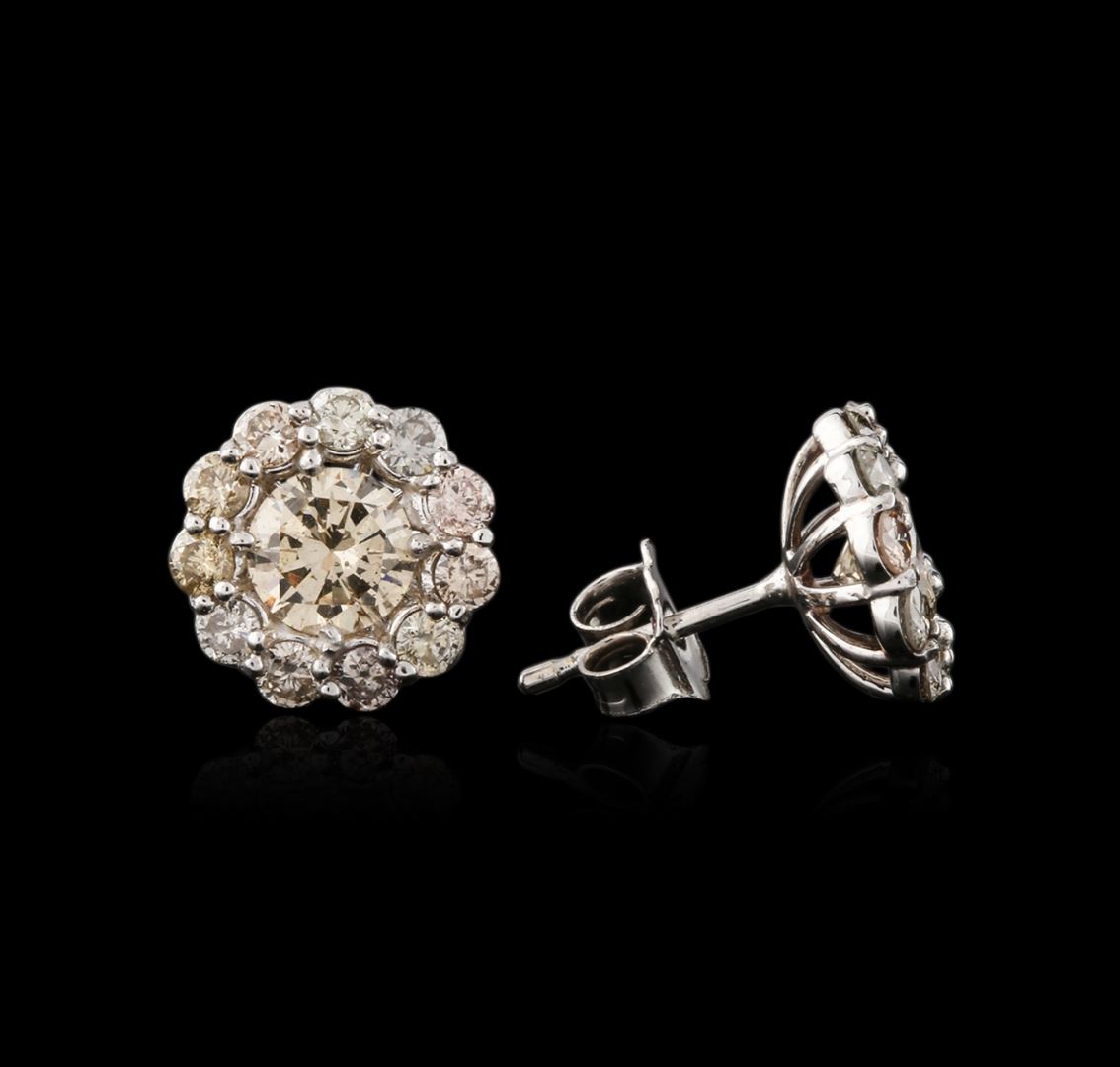 One pair electronically tested 14KT white gold ladies cast & assembled diamond earrings with standard backs. Each earring features a diamond set within a diamond floret bezel. Bright polish finish. Identified with markings of "14K". Condition is good. Containing: Two prong set round brilliant cut diamonds, measuring 5.40 - 5.30 x 3.21mm (depth est.) approximate total weight of 2 Stones = 1.15ct. Color grade is an average for the pair. Graded in the setting. Clarity: SI-1 to SI-2 Twenty-Two prong set round brilliant cut diamonds, measuring 2.30 - 2.20 x 1.35mm (depth est.) approximate total weight of 22 Stones = 1.01ct. The group is composed of a mix of natural very light brown to light brown color diamonds. Graded in the setting. Clarity: SI-1 to I-1. Total Weight of Diamonds 2.16ct. Total Weight of Earrings 2.28 grams. AIG Appraised at $5,640.00.