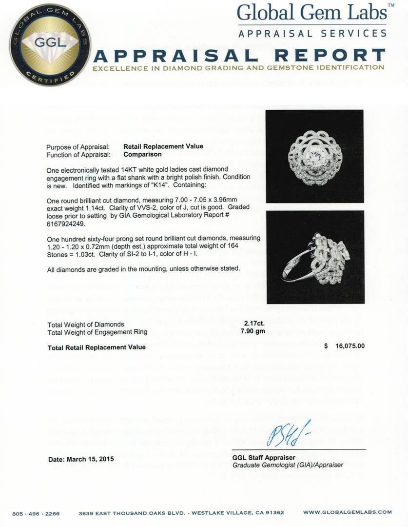 One electronically tested 14KT white gold ladies cast diamond engagement ring with a flat shank with a bright polish finish. Identified with markings of "K14". Condition is new. Containing: One round brilliant cut diamond, measuring 7.00 - 7.05 x 3.96mm exact weight 1.14ct. Clarity of VVS-2, Color of J, Cut is Good. Graded loose prior to setting by GIA Gemological Laboratory Report # 6167924249. One Hundred Sixty-Four prong set round brilliant cut diamonds, measuring 1.20 - 1.20 x 0.72mm (depth est.) approximate total weight of 164 Stones = 1.03ct. Clarity of SI-2 to I-1, Color of H - I. All diamonds are graded in the mounting, unless otherwise stated. Total Weight of Diamonds 2.17ct. Total Weight of Engagement Ring 7.90 grams. GGL Appraised at $16,075.00.