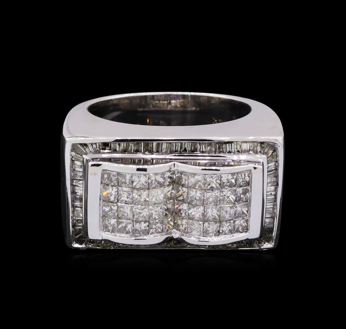 One electronically tested 14KT white gold man's combination cast & assembled ring with a bright polish finish. Condition is new. Identified with markings of "14K". Containing: Forty pave' set princess cut diamonds, measuring 2.00 x 1.70 x 1.28mm (depth est.) approximate. Total Weight of 40 Stones = 1.42ct. Clarity: SI-1 to I-1. Color: H - J, Cut is Good. Sixty-Four channel set baguette cut diamonds, measuring 1.50 x 1.00 x 0.85mm (depth est.) approximate. Total Weight of 64 Stones = 0.74ct. Clarity: SI-1 to I-1. Color: H - I, Cut is Good. Total Weight of Diamonds 2.17ct. Total Weight of Ring 21.50gm. GGL Appraised at $12,270.00.