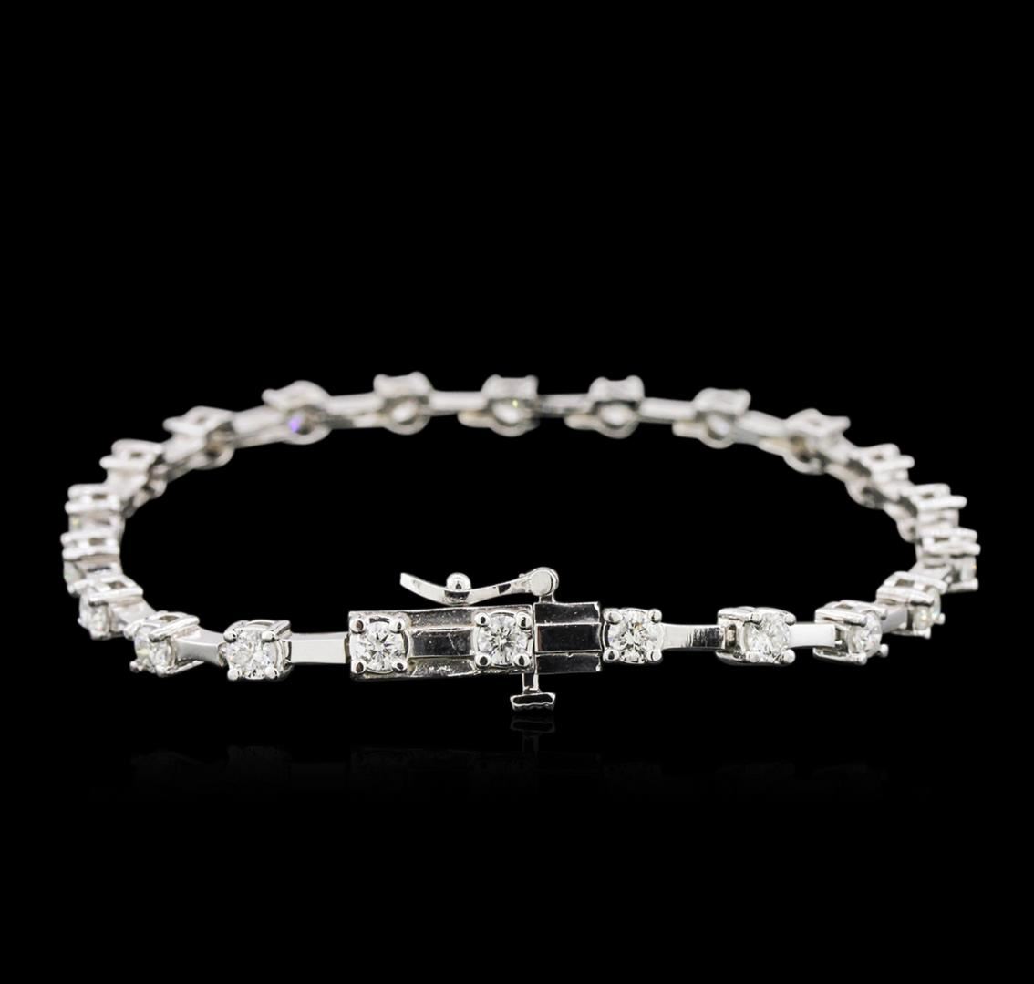 One electronically tested 14KT white gold ladies cast diamond bracelet with a hidden box clasp with safety closer with a bright polish finish. Measurements: 7 " in length Identified with markings of "14K". Condition is new. Containing: Twenty-Two prong set round brilliant cut diamonds, measuring 3.00 - 3.00 x 1.80mm (depth est.) approximate total weight of 22 Stones = 2.17ct. Clarity: SI-2 to I-2. Color: I - J, Cut is Good. All diamonds are graded in the mounting, unless otherwise stated. Total Weight of Diamonds 2.17ct. Total Weight of Bracelet 12.30 grams. GGL Appraised at $5,930.00.