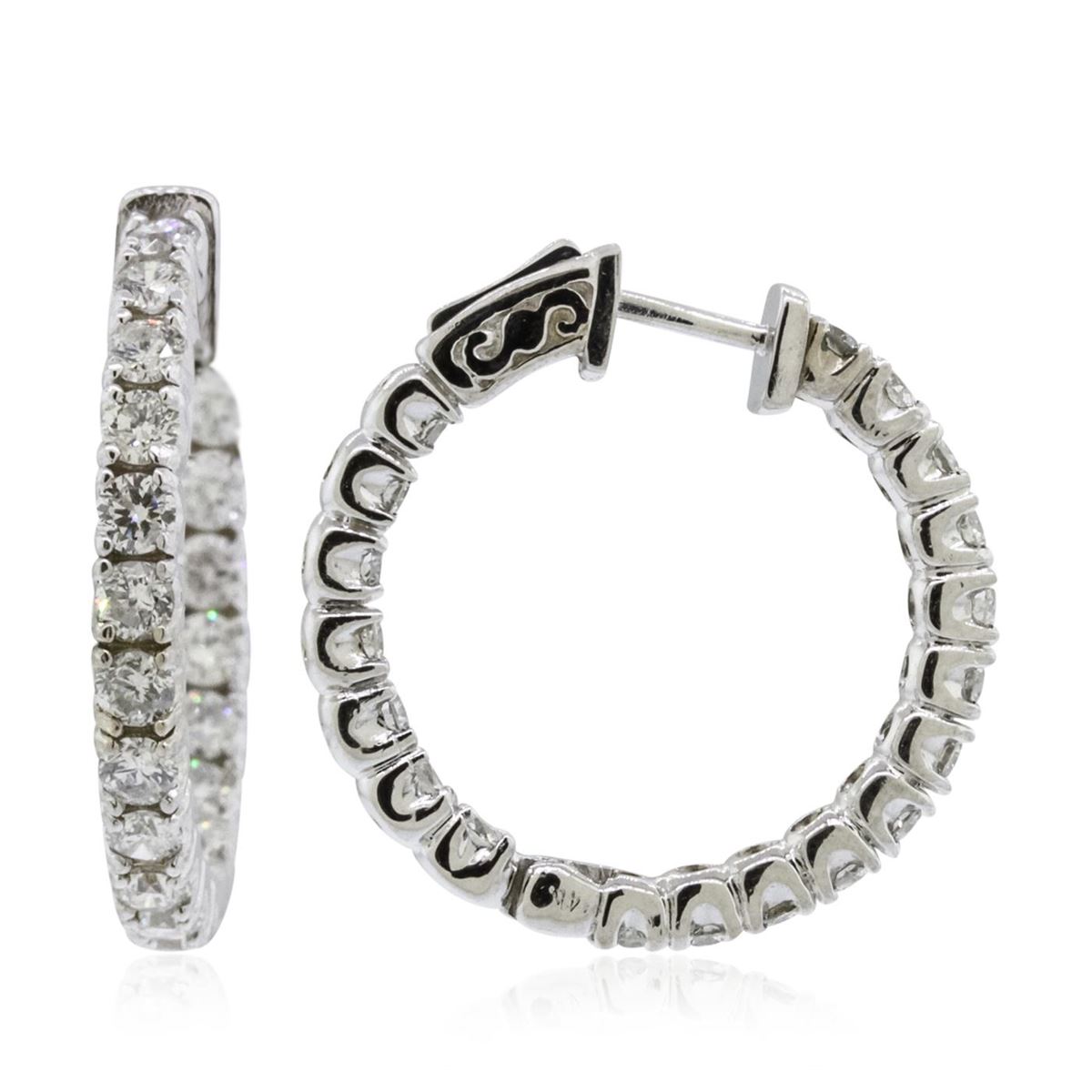 One pair electronically tested 14KT white gold ladies combination cast & assembled hoop earrings with hinged clip backs with a bright polish finish. Identified with markings of "14K". Condition is new. Containing: Thirty-Eight prong set round brilliant cut diamonds, measuring 2.50 - 2.50 x 1.50mm (depth est.) approximate total weight of 38 Stones = 2.17ct. Clarity: SI-2 to I-1. Color: I - J, Cut is Good. All diamonds are graded in the mounting, unless otherwise stated. Total Weight of Diamonds 2.17ct. Total Weight of Earrings 9.00 grams. GGL Appraised at $7,725.00.