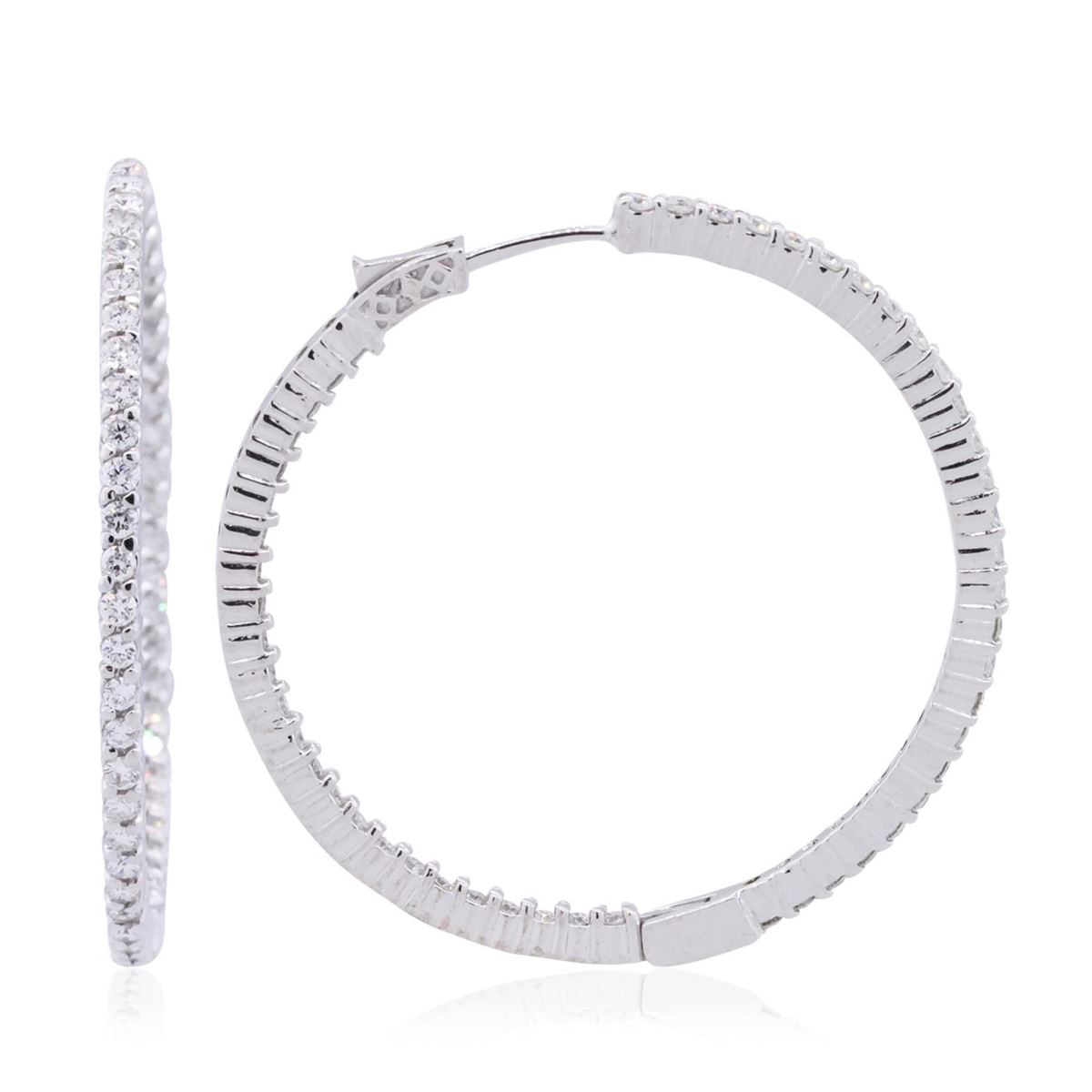 One pair electronically tested 14KT white gold ladies combination cast & assembled hoop earrings with hinged clip backs with a bright polish finish. Condition is new. Containing: One Hundred Two prong set round brilliant cut diamonds, measuring 1.80 - 1.80 x 1.08mm (depth est.) approximate total weight of 102 Stones = 2.17ct. Clarity: SI-2 to I-1. Color: H - J, Cut is Good. All diamonds are graded in the mounting, unless otherwise stated. Total Weight of Diamonds 2.17ct. Total Weight of Earrings 17.40 grams. GGL Appraised at $8,345.00.