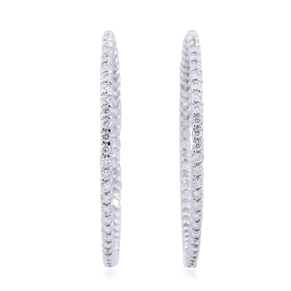 One pair electronically tested 14KT white gold ladies combination cast & assembled hoop earrings with hinged clip backs with a bright polish finish. Condition is new. Containing: One Hundred Two prong set round brilliant cut diamonds, measuring 1.80 - 1.80 x 1.08mm (depth est.) approximate total weight of 102 Stones = 2.17ct. Clarity: SI-2 to I-1. Color: H - J, Cut is Good. All diamonds are graded in the mounting, unless otherwise stated. Total Weight of Diamonds 2.17ct. Total Weight of Earrings 17.40 grams. GGL Appraised at $8,345.00.