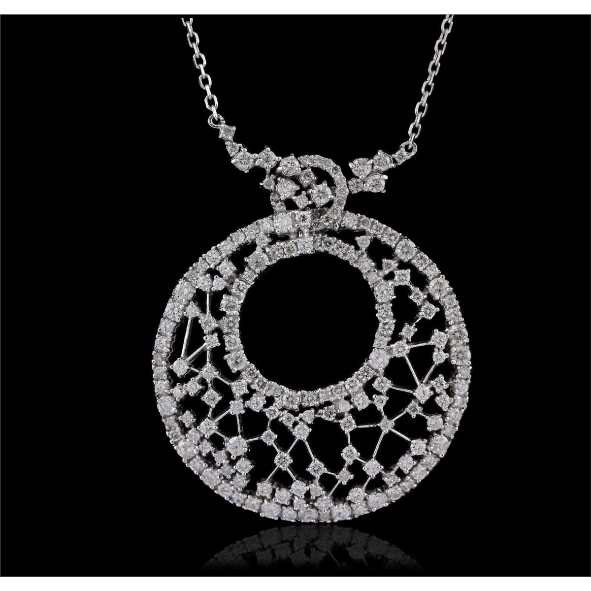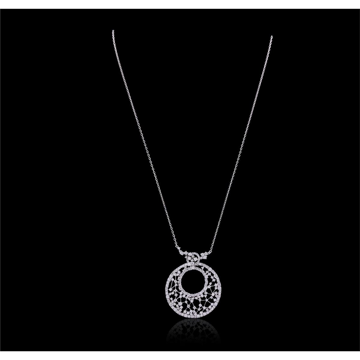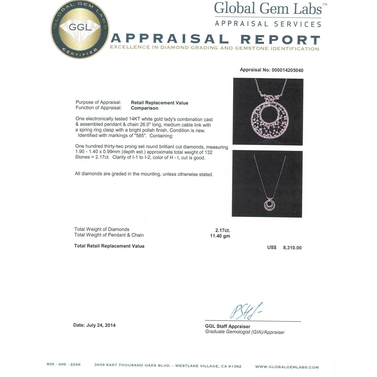One electronically tested 14KT white gold ladies combination cast & assembled pendant & chain 26.0" long, medium cable link with a spring ring clasp with a bright polish finish. Condition is new. Identified with markings of "585". Containing: One Hundred Thirty-Two prong set round brilliant cut diamonds, measuring 1.90 - 1.40 x 0.99mm (depth est.) approximate total weight of 132 Stones = 2.17ct. Clarity: I-1 to I-2. Color: H - I, Cut is Good. All diamonds are graded in the mounting, unless otherwise stated. Total Weight of Diamonds 2.17ct. Total Weight of Pendant & Chain 11.40 grams. GGL Appraised at $8,310.00.