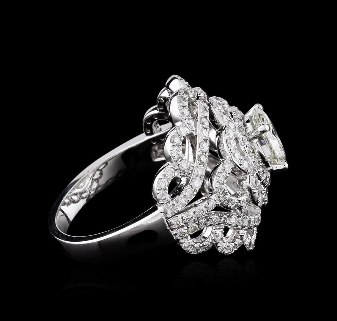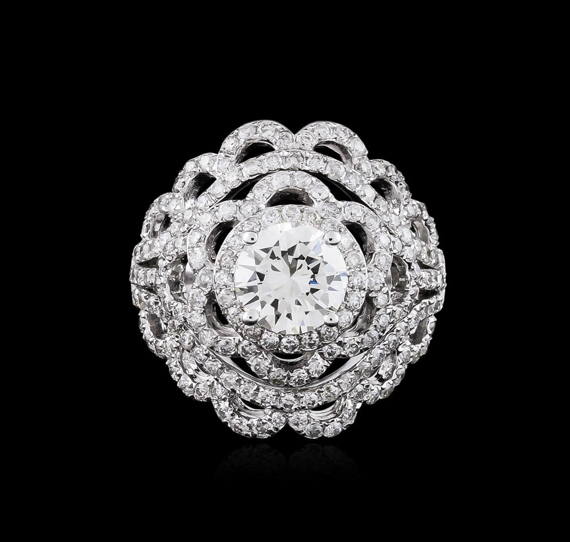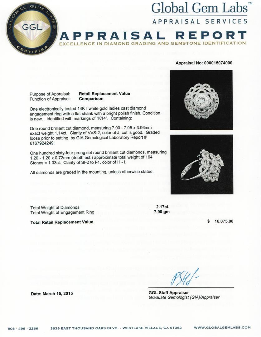 One electronically tested 14KT white gold ladies cast diamond engagement ring with a flat shank with a bright polish finish. Identified with markings of "K14". Condition is new. Containing: One round brilliant cut diamond, measuring 7.00 - 7.05 x 3.96mm exact weight 1.14ct. Clarity of VVS-2, Color of J, Cut is Good. Graded loose prior to setting by GIA Gemological Laboratory Report # 6167924249. One Hundred Sixty-Four prong set round brilliant cut diamonds, measuring 1.20 - 1.20 x 0.72mm (depth est.) approximate total weight of 164 Stones = 1.03ct. Clarity of SI-2 to I-1, Color of H - I. All diamonds are graded in the mounting, unless otherwise stated. Total Weight of Diamonds 2.17ct. Total Weight of Engagement Ring 7.90 grams. GGL Appraised at $16,075.00.